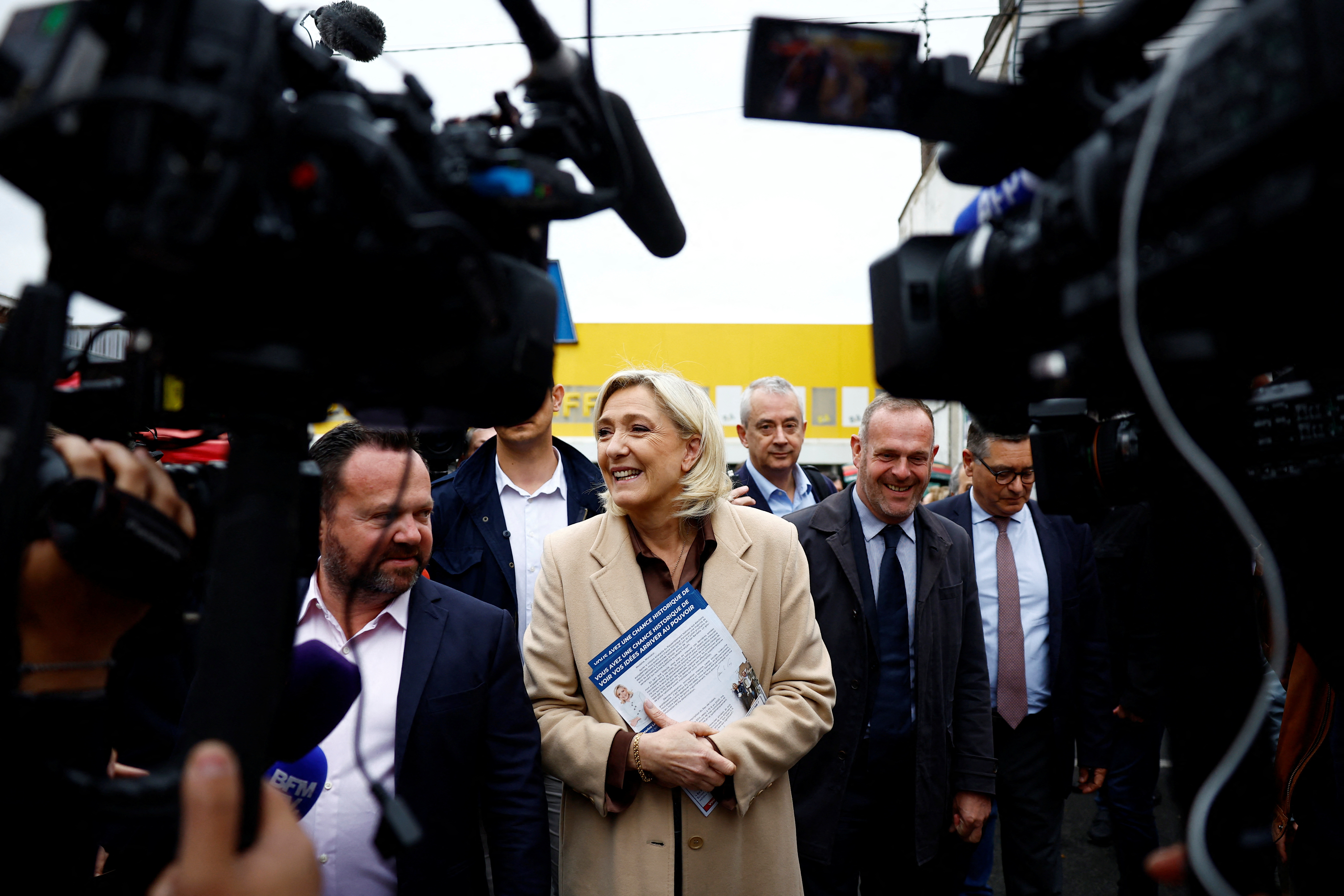 玛丽·勒庞,法国极右翼领袖和法国极右翼国民集会(Rassemblement National - RN)党在即将到来的议会选举中的候选人,被记者包围,与亨尼-博蒙市市长斯蒂夫·布里奥瓦和当地RN政治家布鲁诺·比尔德一起在市场上派发传单…阅读更多巴黎,6月20日(路透社) - 据三项民调显示,玛丽·勒庞的极右翼国民集会在法国的议会选举中领先,领先于左翼人民阵线和总统埃马纽埃尔·马克龙的中间派。议会选举,周四显示,民调机构IFOP为广播集团TF1和《费加罗报》进行的调查显示,国民集会(RN)将获得34%的选票,而人民阵线将获得29%,马克龙的团结阵营将获得22%。另一项由Harris Interactive进行的民调 - 为RTL电台、M6电视台和《挑战杂志》进行的 - 将RN支持率为33%,而左翼支持率为26%,马克龙的阵营支持率为21%。