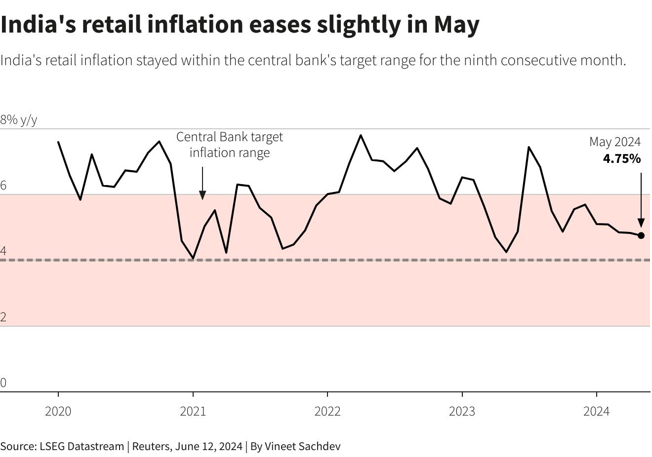 一名劳动者在印度北部城市昌迪加尔的批发粮食市场卸下装满大米的袋子,摄于2014年7月29日。路透社/Ajay Verma/文件照片6月21日(路透社)- 印度的食品通胀受到供应端因素(如影响作物的恶劣天气)的推动,自2023年11月以来一直保持在约8%的年同比水平,并且不太可能很快缓解,尽管季风雨季提前到来。季风雨和高于正常降雨量的预测。食品价格居高不下,几乎占据了整体消费价格篮子的一半,使得总体通胀率保持在央行4%的目标之上,阻止了其降息。