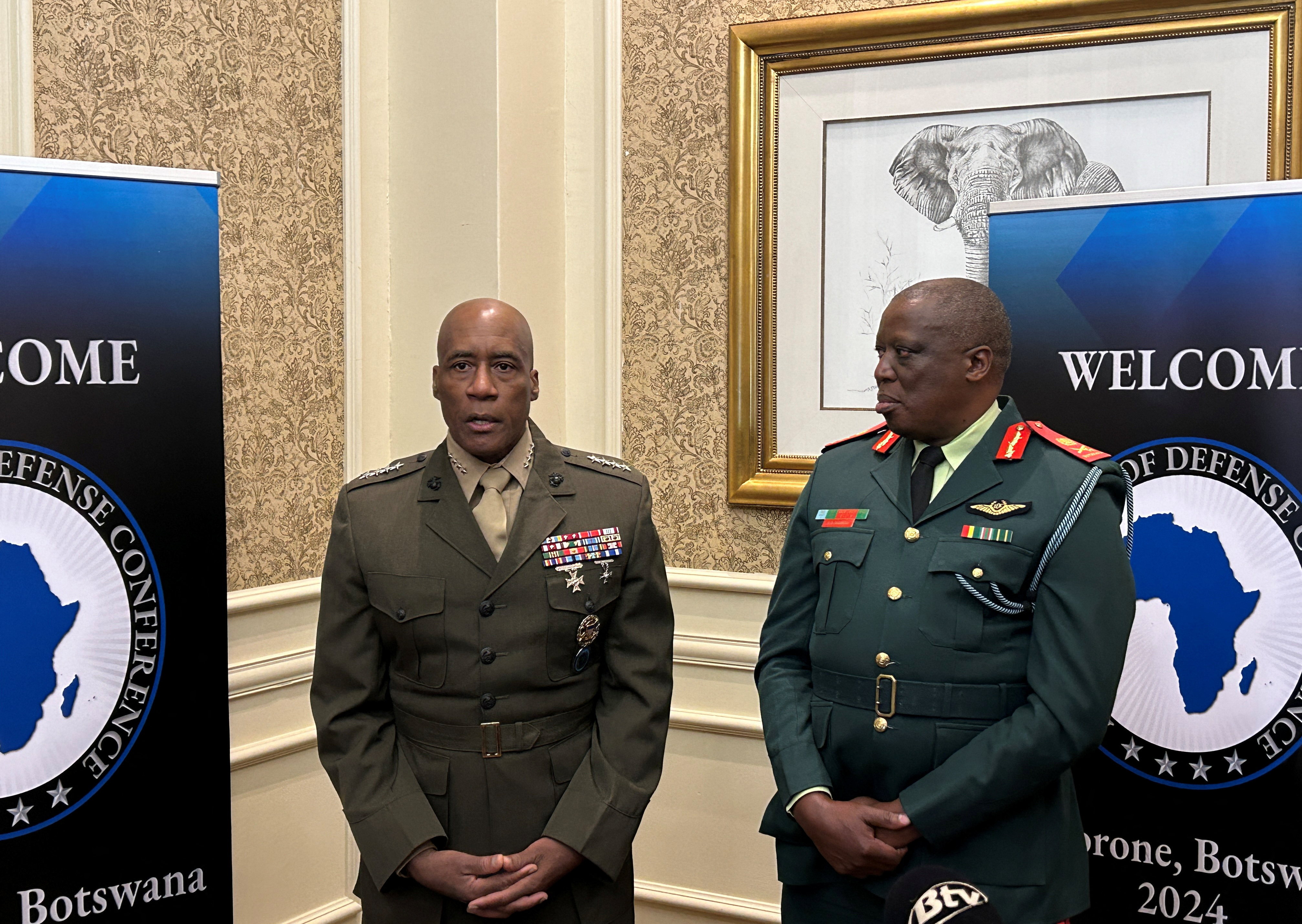 第1项共3项 美国海军陆战队将军迈克尔·兰利,非洲司令部司令,与博茨瓦纳国防军司令普拉西德·塞戈科在2024年6月25日于博茨瓦纳哈博罗内的一次国防会议上与记者交谈。路透社/菲尔·斯图尔特