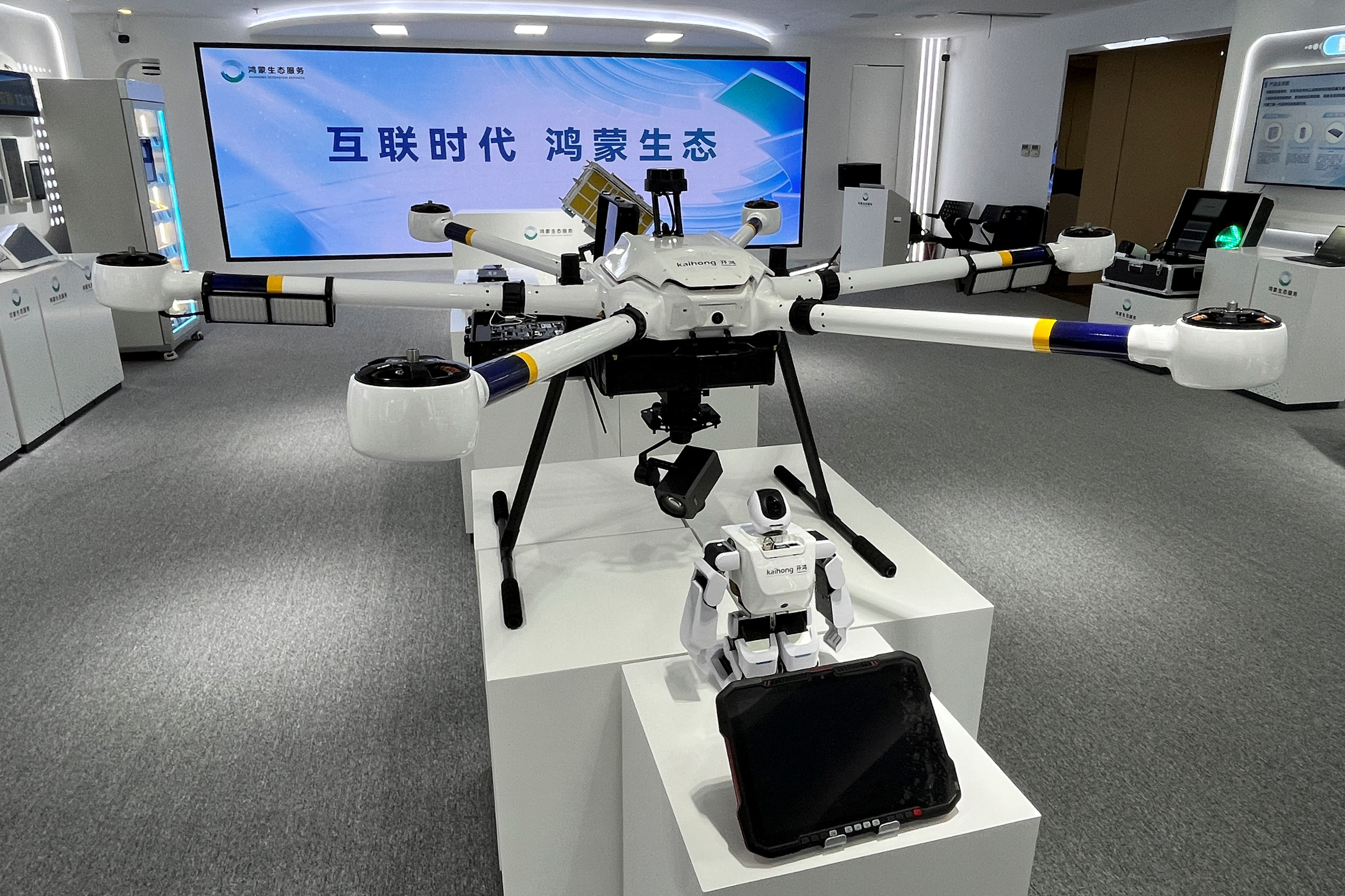2个设备上运行的OpenHarmony,华为Harmony操作系统的开源版本,在2024年4月9日在中国广东省深圳的Harmony生态创新中心展出。路透社/大卫·柯顿/文件照片中国深圳,2024年6月28日(路透社)- 一架无人机,双足机器人,超市结账机等设备被塞进一个小房间,展示了中国软件未来的愿景-一个由国家冠军华为开发的操作系统取代了Windows和Android。