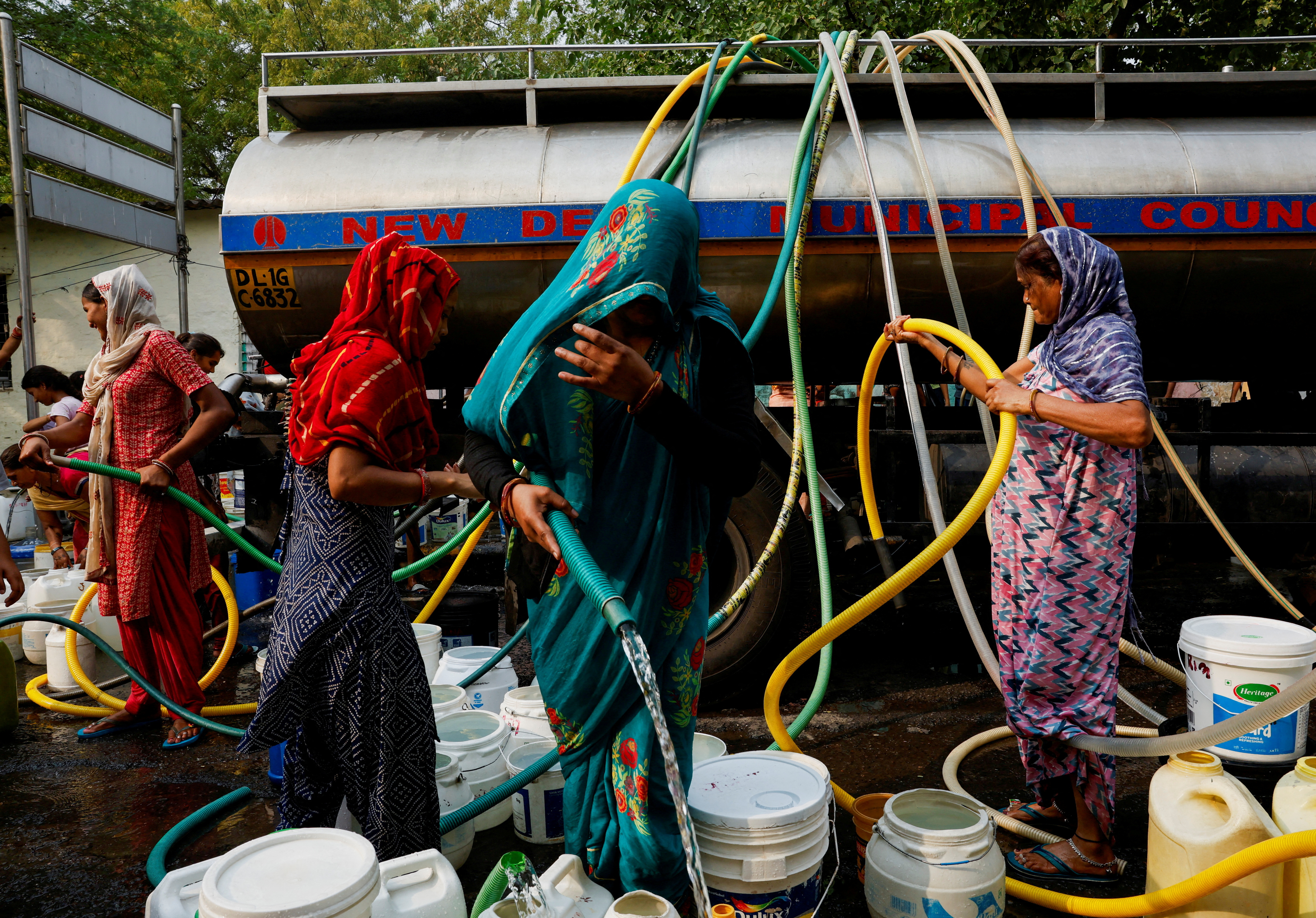 2个项目中的第1个居民在印度新德里的炎热一天中使用管道从水罐车中灌满他们的容器饮用水,2024年6月24日。路透社/Priyanshu Singh/文件照片