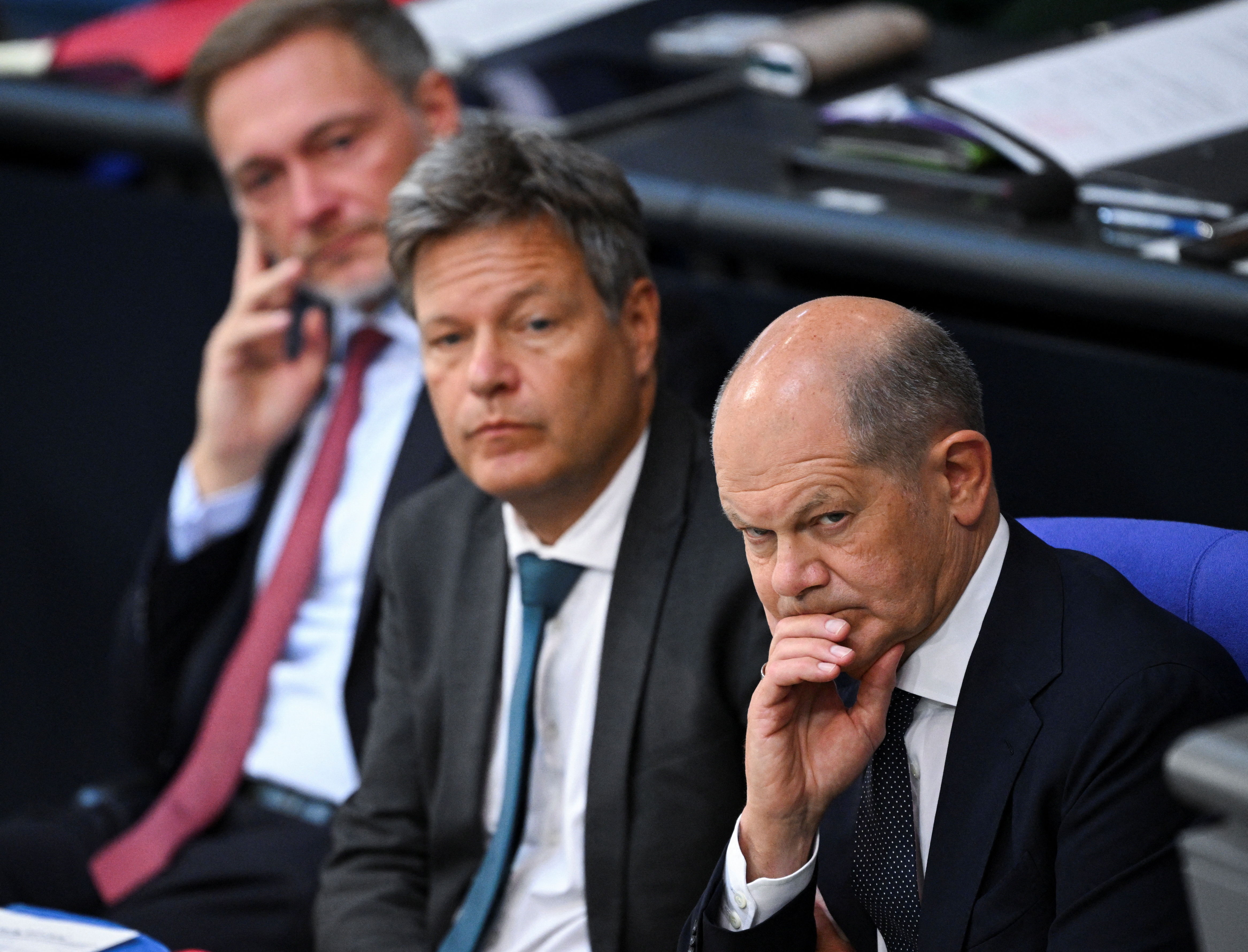 德国总理奥拉夫·肖尔茨、经济和气候部长罗伯特·哈贝克以及财政部长克里斯蒂安·林德纳在德国柏林下议院,即联邦议院,就当前安全问题发表政府声明后观望,图片拍摄于2024年6月6日。路透社/安妮格雷特·希尔瑟/档案照片柏林,6月28日(路透社)- 德国的三方联盟已经数月来在解决明年预算方面的分歧。社会民主党(SPD)总理奥拉夫·肖尔茨、绿党经济部长罗伯特·哈贝克和自由民主党(FDP)财政部长克里斯蒂安·林德纳计划在下周至少达成大致一致。