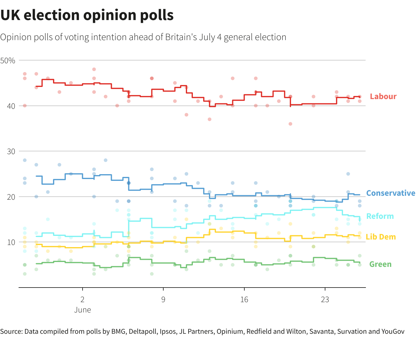 右翼改革英国党(Reform UK Party)在竞选期间人气激增,威胁到从保守党带走选票,下降2个百分点至16%。