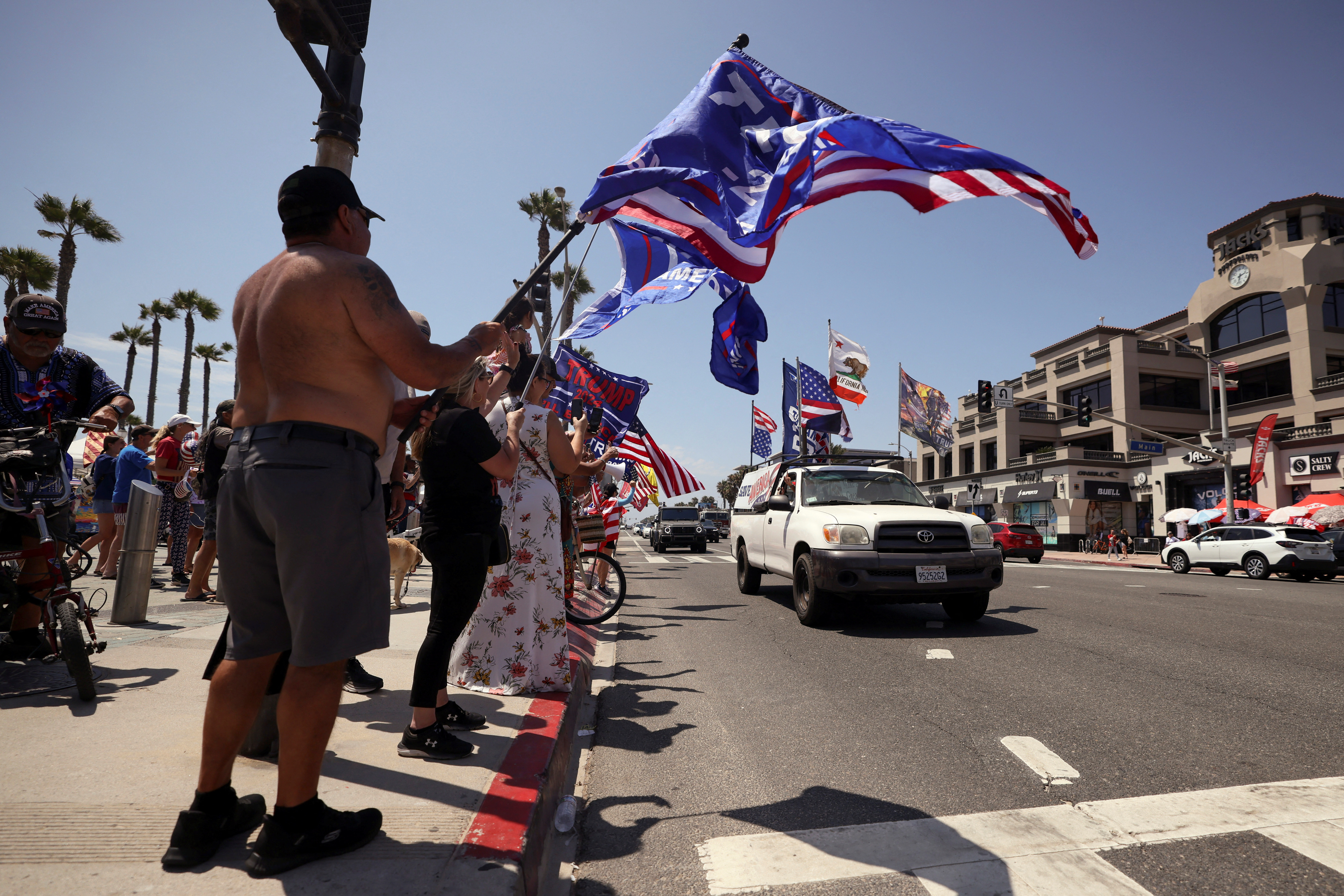 支持特朗普的支持者在加利福尼亚州亨廷顿海滩举行的示威活动中,一辆汽车装有美国和支持特朗普的旗帜行驶,他们欢呼雀跃。前美国总统唐纳德·特朗普在一次集会中遭到暗杀未遂,发生在前一天,即2024年7月14日。路透社/埃蒂安·洛朗 华盛顿,7月14日(路透社)- 在对前美国总统唐纳德·特朗普的暗杀未遂事件发生几小时内,许多支持者开始指责民主党,试图改变谁煽动了美国激烈政治言论的脚本,因为政治暴力案件达到了历史性的高度。