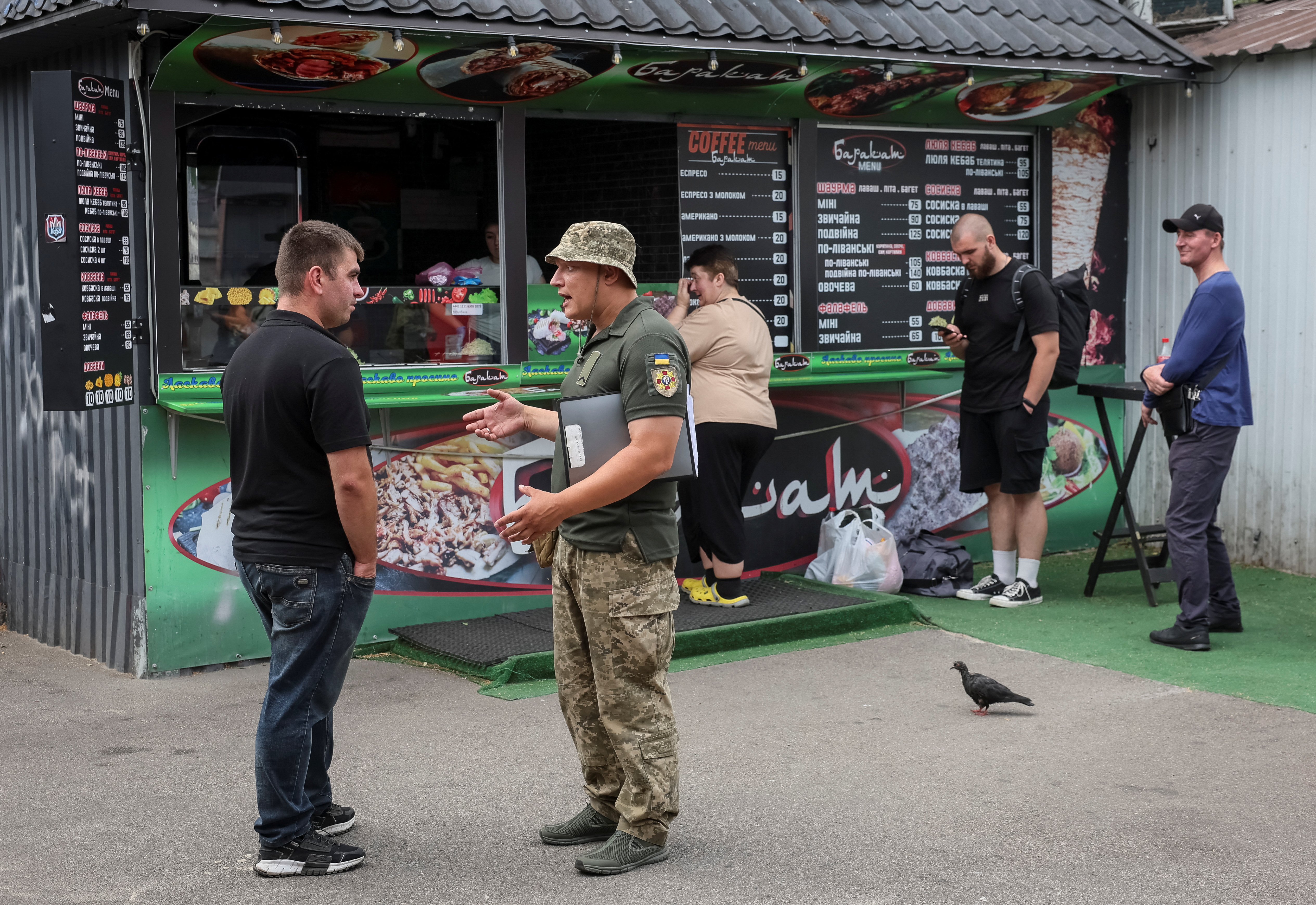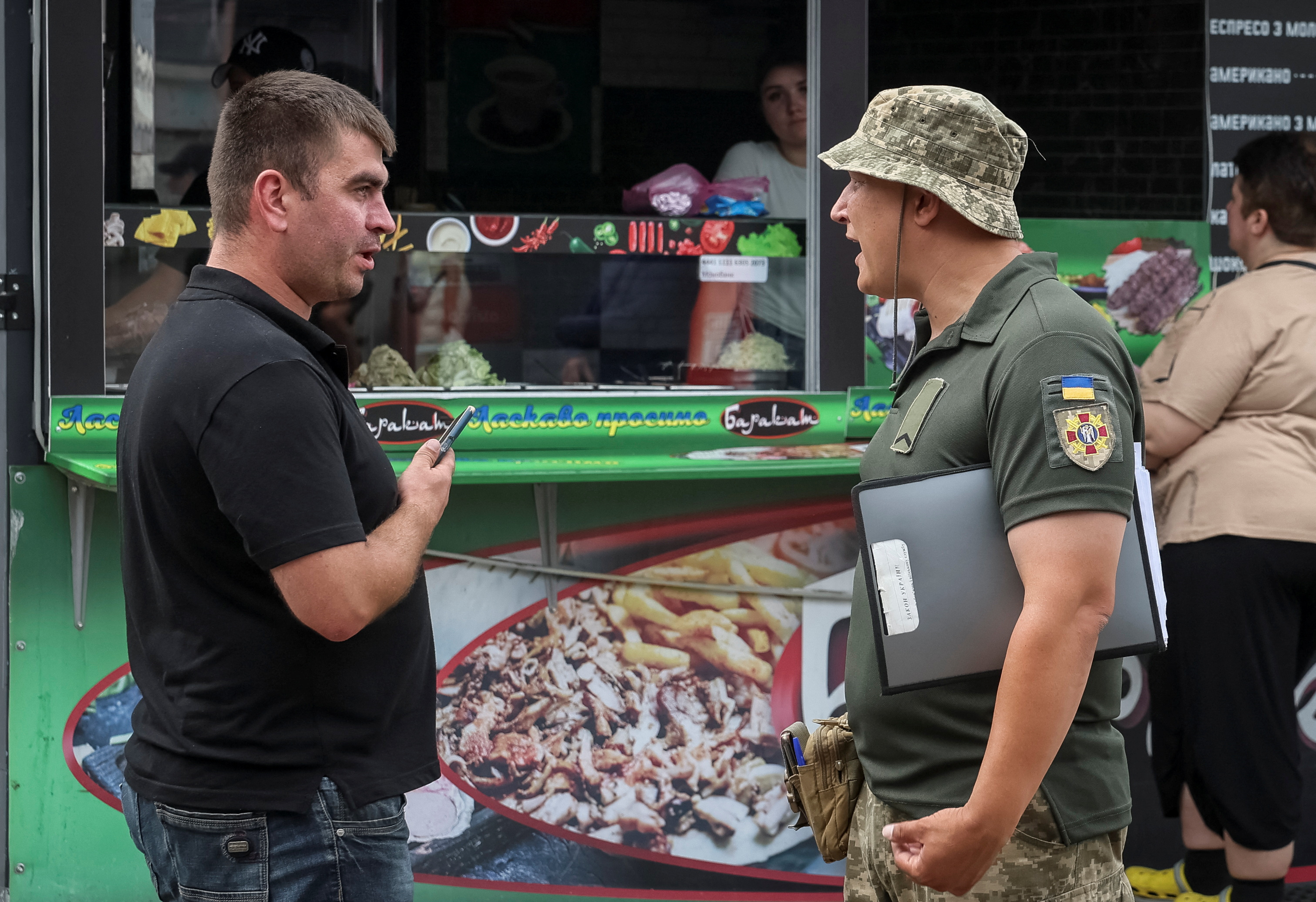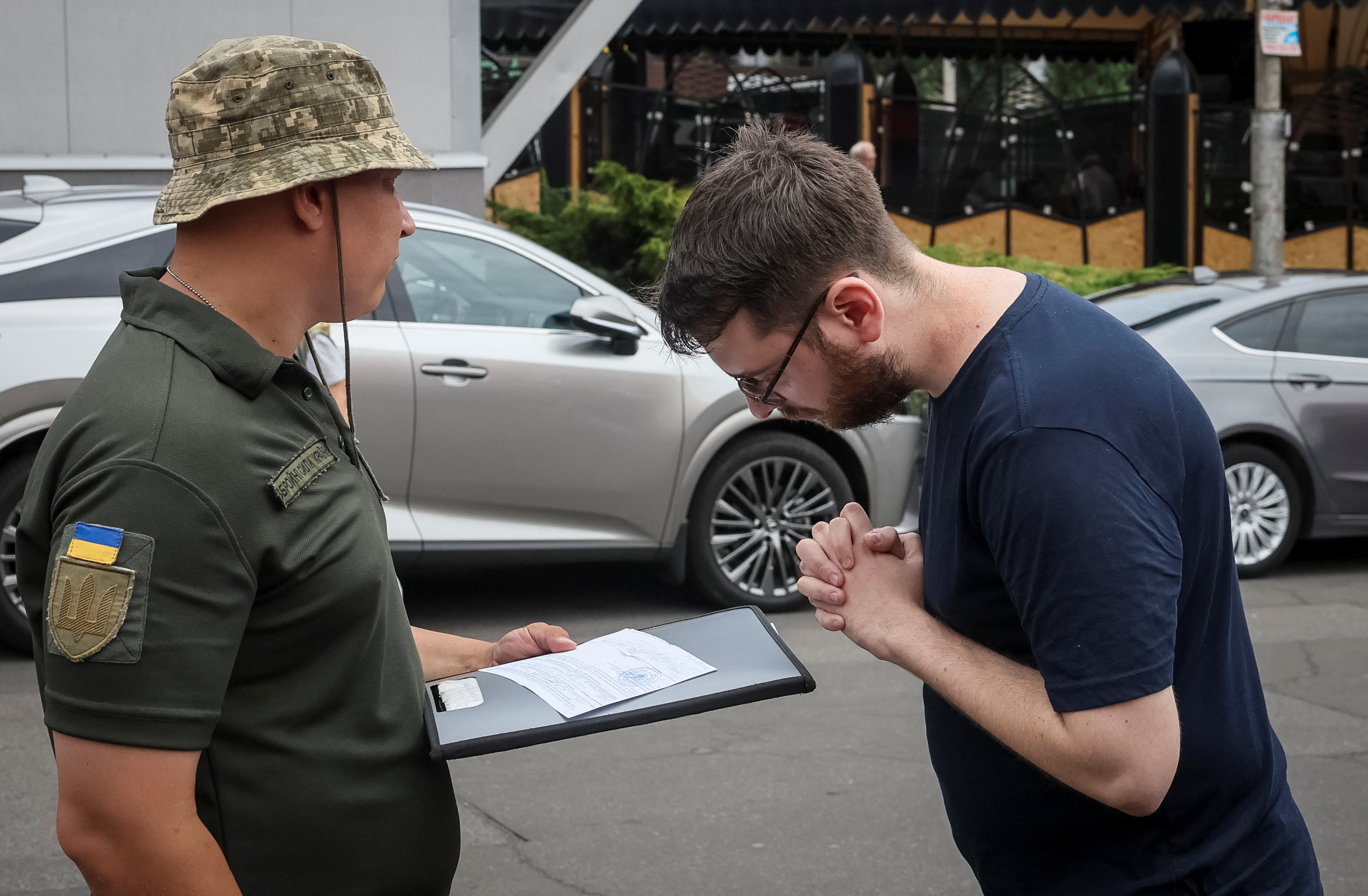 第1项6名招募官员,代号“Fantomas”,在乌克兰基辅,俄罗斯袭击乌克兰期间,与一名男子在街上交谈,检查男子的文件并发放军事征召令。2024年7月3日。路透社/Gleb Garanich