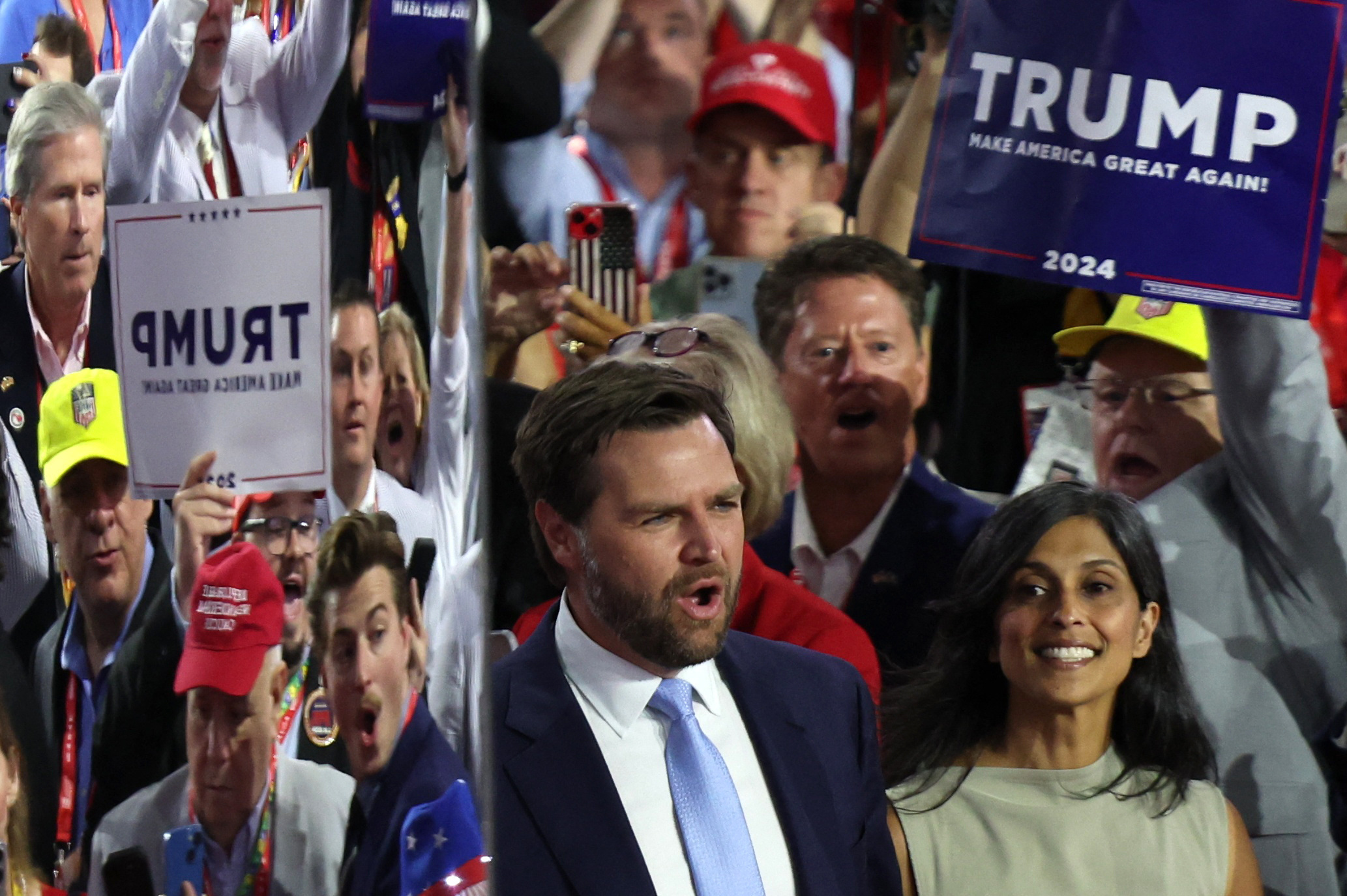 5项中的第1项,共和党副总统候选人J.D.范斯与他的妻子乌莎·奇卢库里·范斯一起抵达2024年7月15日在美国威斯康星州密尔沃基费泽夫论坛举行的共和党全国代表大会(RNC)第1天。路透社/安德鲁·凯利