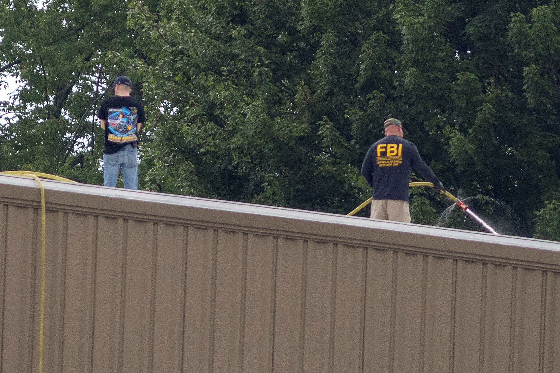 第1项 FBI调查人员在宾夕法尼亚州巴特勒市共和党总统候选人和前美国总统唐纳德·特朗普竞选集会上发生枪击事件的执法调查中,冲洗了一名枪手曾经驻扎的屋顶,2024年7月14日,美国。路透社/卡洛斯·奥索里奥/文件照片