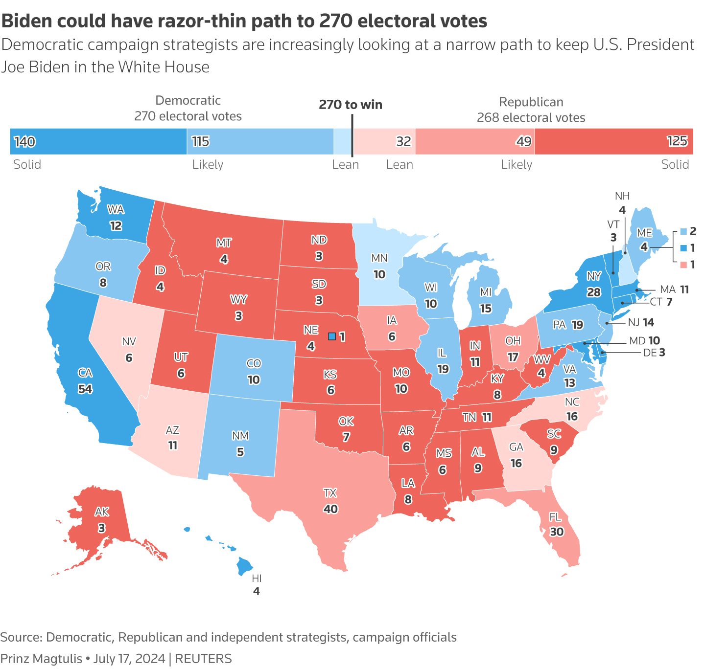 78岁的特朗普在上周末被子弹擦伤之前一直在这四个州的民意调查中领先,这一位置在拜登在6月27日的灾难性辩论表现后得到巩固。在选举日之前,计算可能会发生变化。但竞选官员最新的评估几乎不允许出现任何错误。81岁的拜登只有在赢得宾夕法尼亚州、威斯康星州和密歇根州这三个工业州以及内布拉斯加州的一个国会选区(该选区也可能很快面临风险)的情况下,才能凑齐赢得总统职位所需的270选举人团选票。亲自竞选官员告诉路透社,在亚利桑那州、乔治亚州和内华达州,“情况看起来非常紧张”。“密歇根州、宾夕法尼亚州、威斯康星州是通往270选举人票最清晰的道路。这是我们正在关注的。”