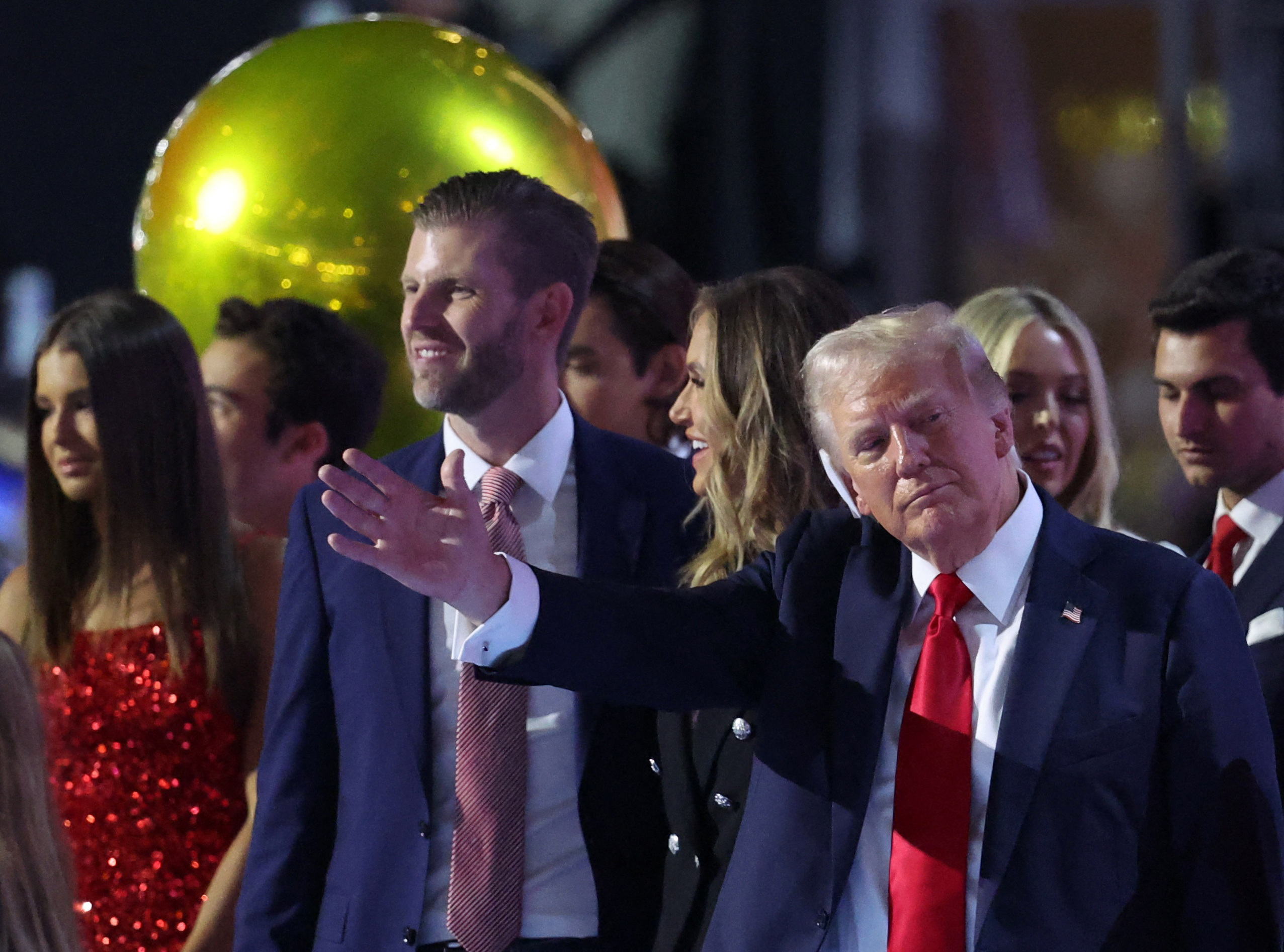 第1项共3项 共和党总统候选人、前美国总统唐纳德·特朗普在共和党全国代表大会(RNC)第4天在威斯康辛州密尔沃基费泽夫论坛(Fiserv Forum)发表讲话后做出手势,2024年7月18日。路透社/吉纳·文(Jeenah Moon)