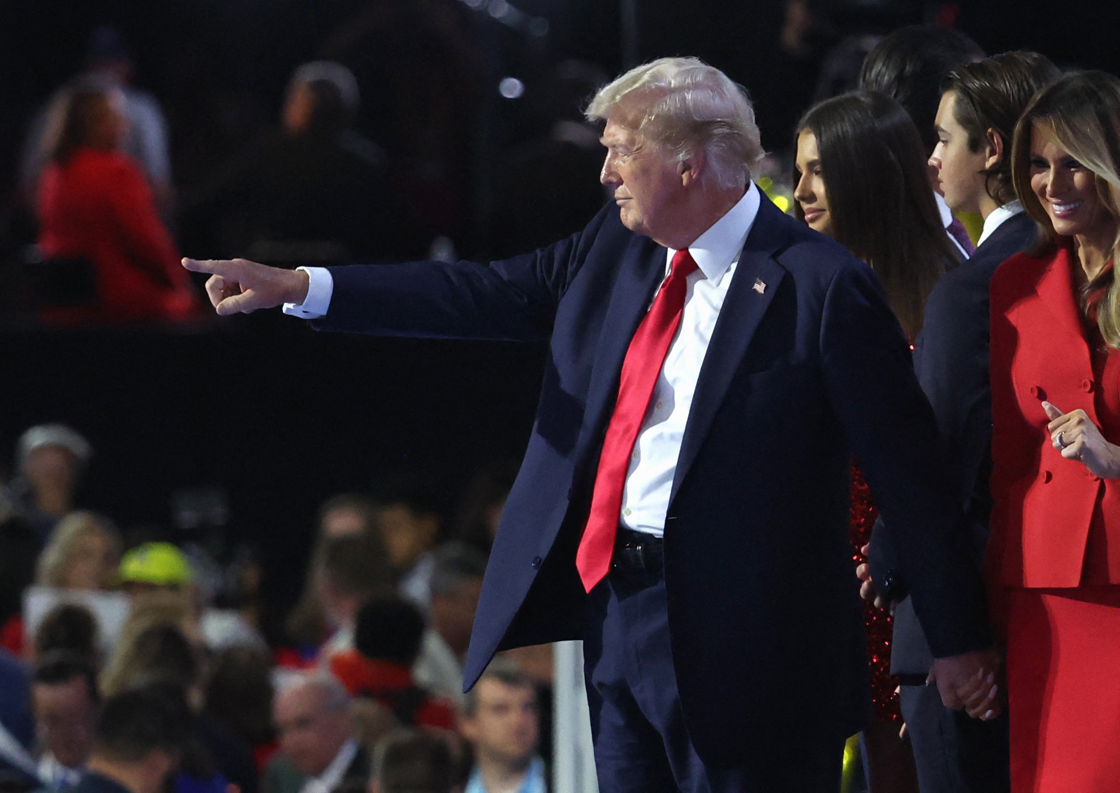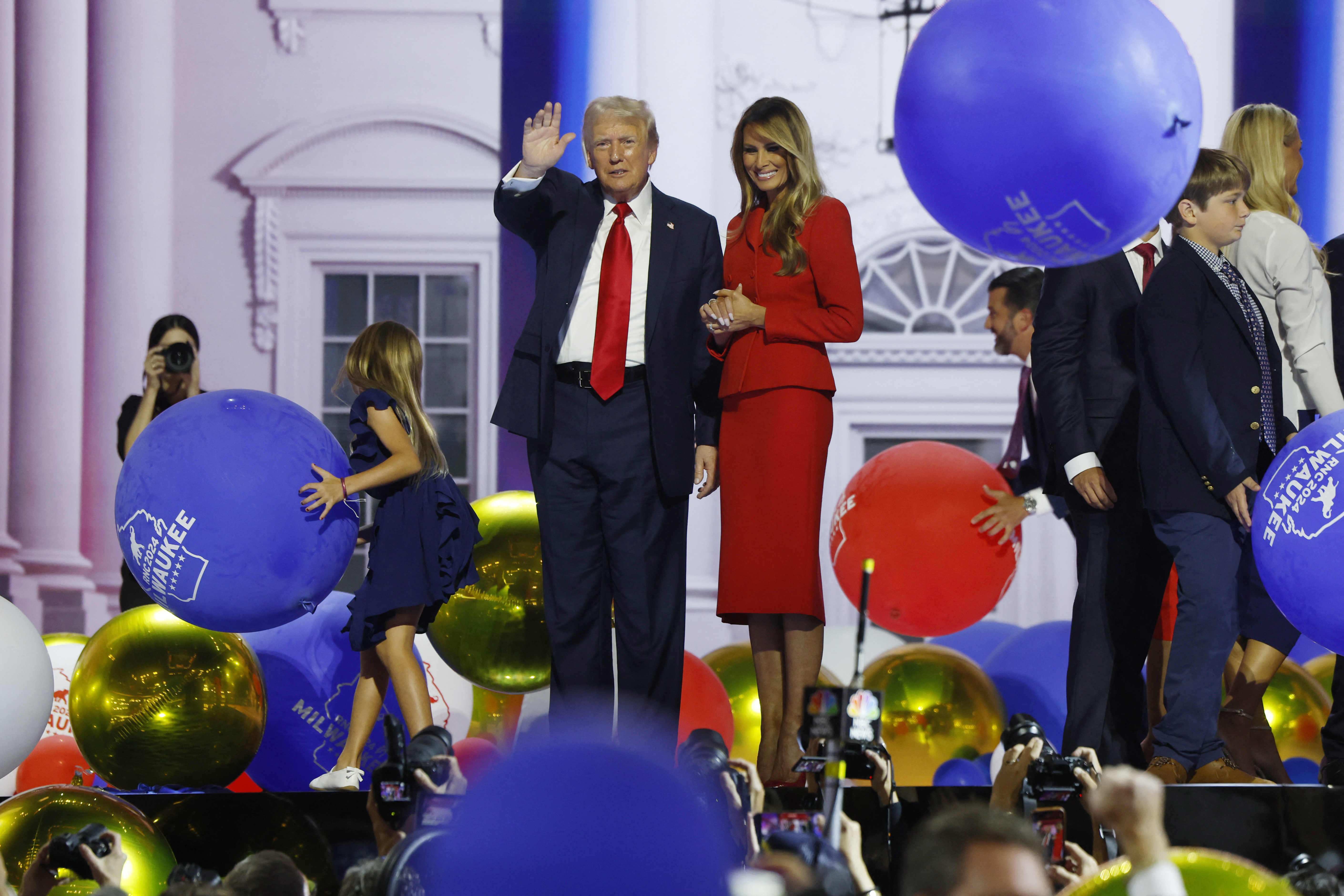 第1项共3项:共和党总统候选人、前美国总统唐纳德·特朗普在共和党全国代表大会(RNC)第4天结束发表接受演讲后,与妻子梅拉尼娅和其他亲属一起登上舞台,地点为美国威斯康星州密尔沃基的费泽夫论坛,2024年7月18日。路透社/伊夫林·霍克斯坦