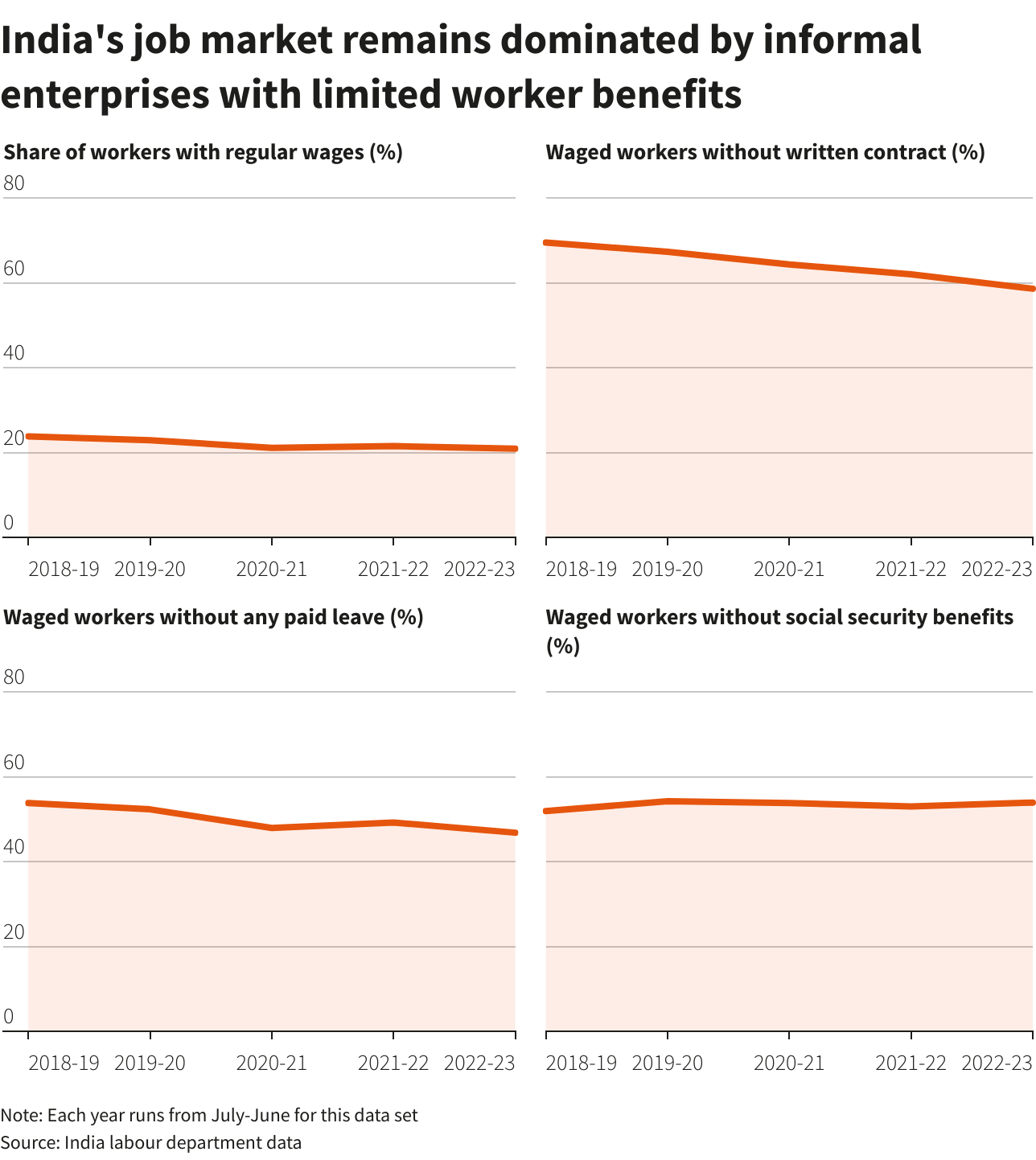 政府数据本月发布的数据显示,自2017/18年以来,印度每年创造了2000万个新的就业机会,但私人经济学家说,其中大部分是自雇和临时农场招工,而不是有固定工资的正式职位。