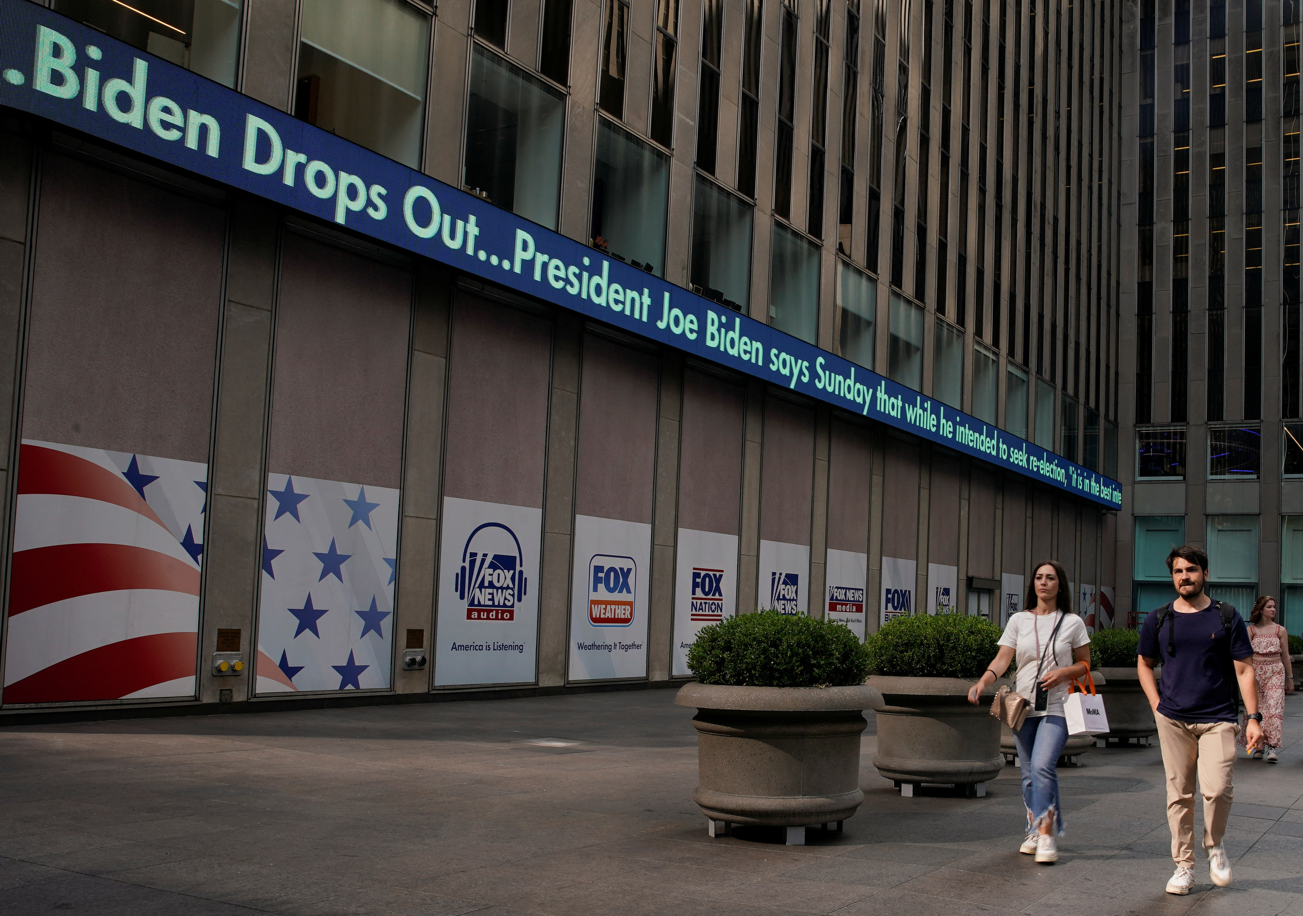 第14项中的第1项 一名人士在美国纽约市曼哈顿区看新闻滚动条,显示美国总统乔·拜登宣布退出连任竞选,2024年7月21日。路透社/埃迪亚多·穆诺斯