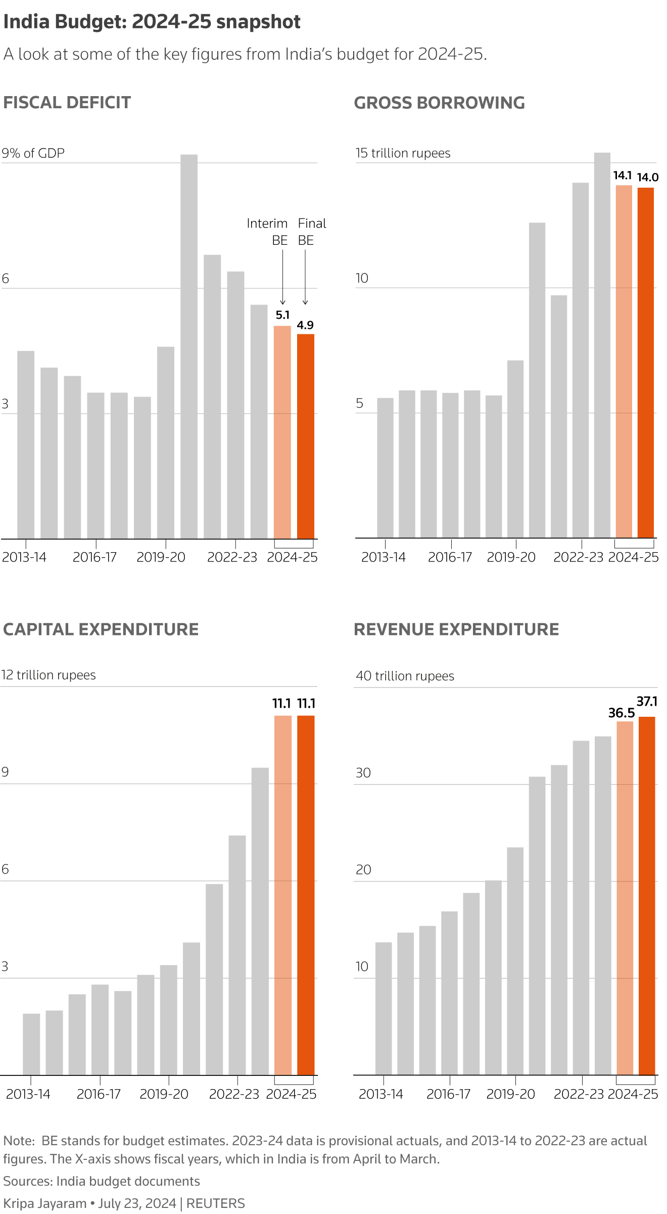 尽管有新的支出,印度将其财政赤字目标从2月份的临时预算中的5.1%下调至2025年3月31日结束的财政年度的4.9%,这得益于中央银行的250亿美元的大额盈余。政府还略微减少了市场总借款至14.01万亿卢比。