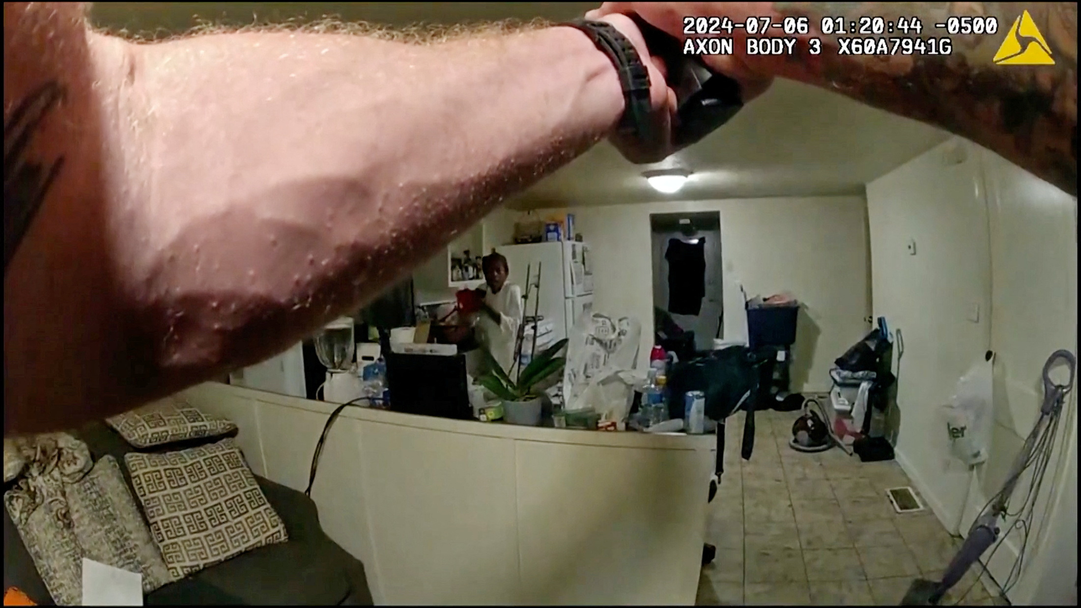 第1项,共5项 桑加蒙县警长副官肖恩·格雷森在7月6日的求助电话中开枪击中索尼亚·梅西后与他的搭档交谈,该事件被伊利诺伊州警察局于2024年7月22日发布的执法记录仪视频中的静态照片捕捉到。 伊利诺伊州警察局/通过路透社提供