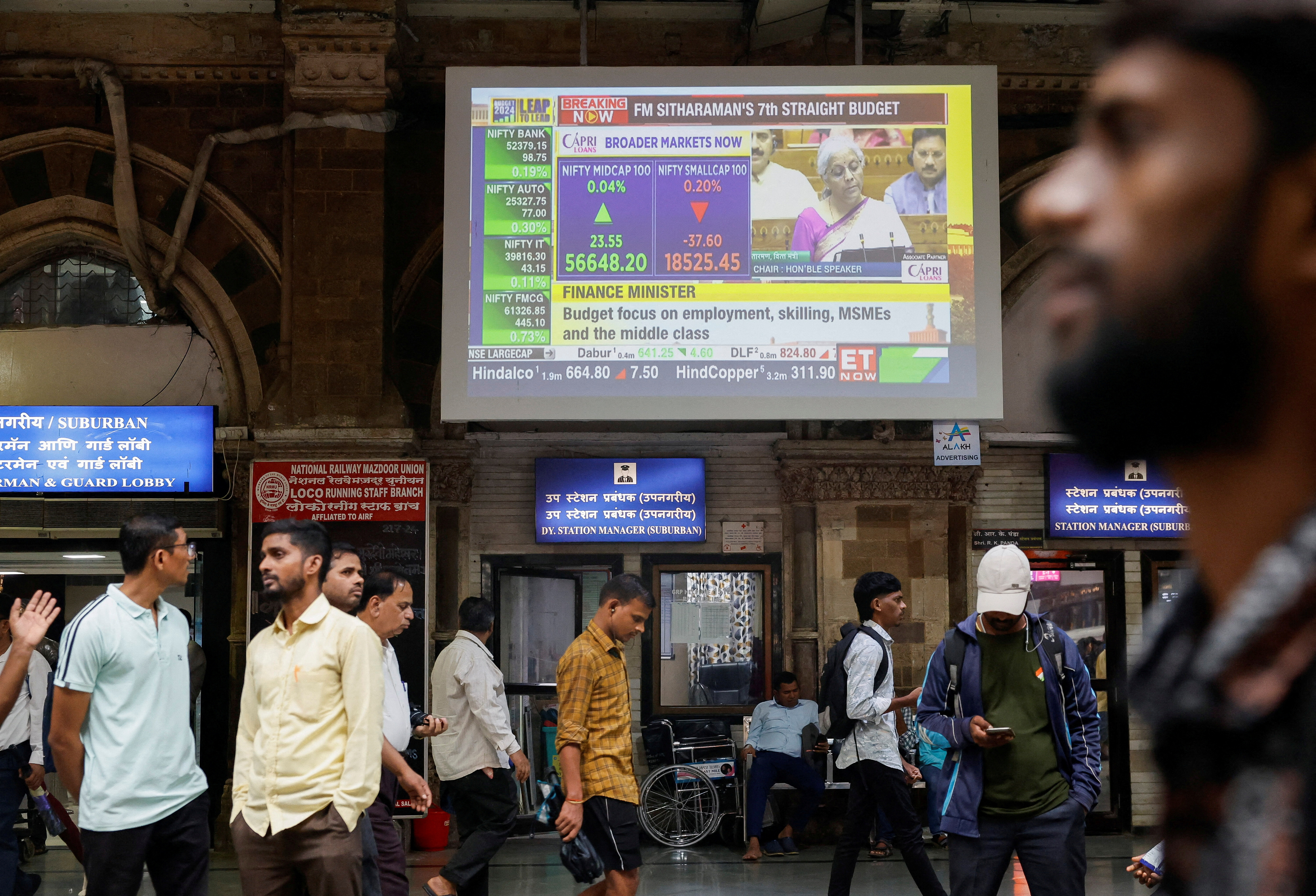 第1项,共3项 人们走过孟买一个火车站显示印度财政部长尼尔马拉·西塔拉曼预算演讲的屏幕,印度,2024年7月23日。路透社/弗朗西斯·马斯卡伦哈斯