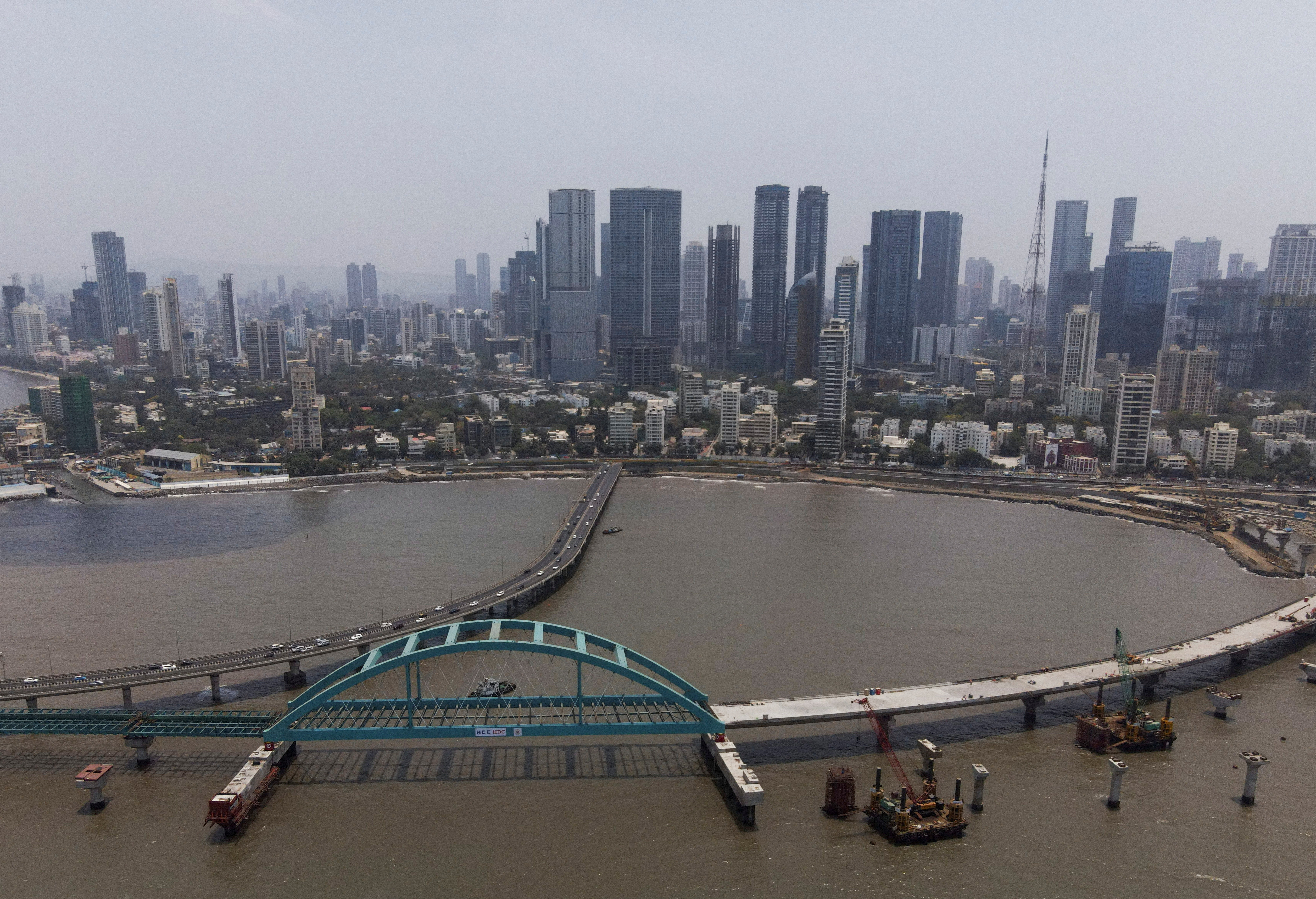 项目1共2项 无人机视角显示了一座弓形拱桥,由印度建设公司安装,将连接孟买的班德拉-沃尔利海桥和沿海公路,印度,2024年4月26日。路透社/弗朗西斯·马斯卡雷纳斯/档案照片