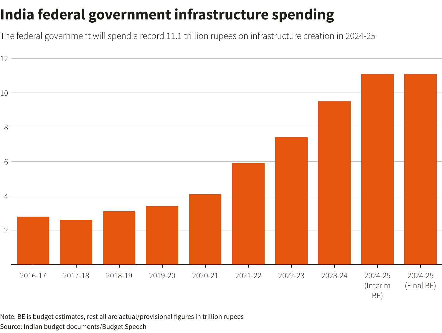 印度将2024-25年的基础设施支出目标维持在创纪录的11.11万亿卢比不变 | 路透社