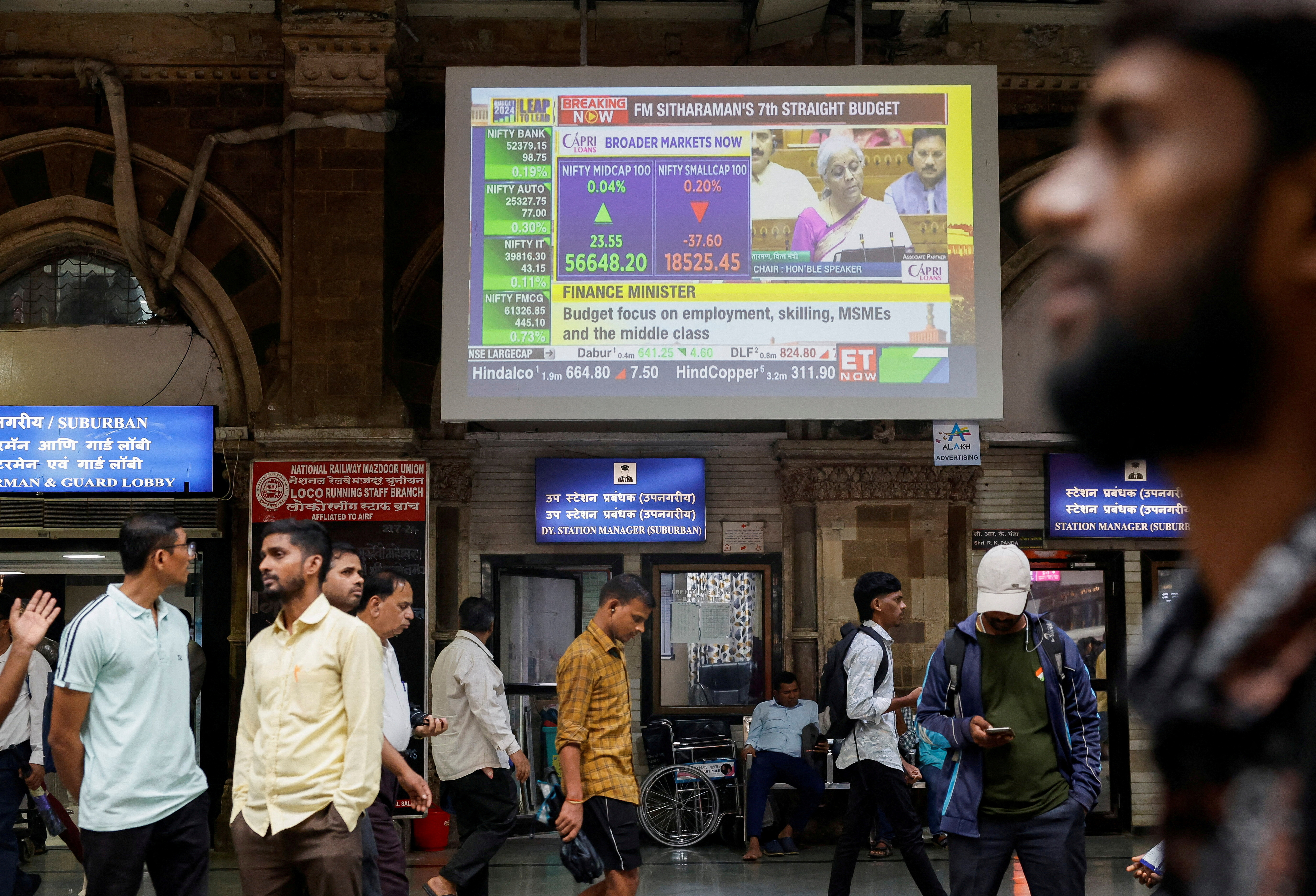 人们在印度孟买的一个火车站走过,屏幕上显示着印度财政部长尼尔马拉·西塔拉曼的预算演讲,时间是2024年7月23日。路透社/弗朗西斯·马斯卡伦哈斯孟买,7月23日(路透社) - 印度周二降低了一些公民的所得税税率,以促进消费,因为亚洲第三大经济体在不均衡增长中挣扎。