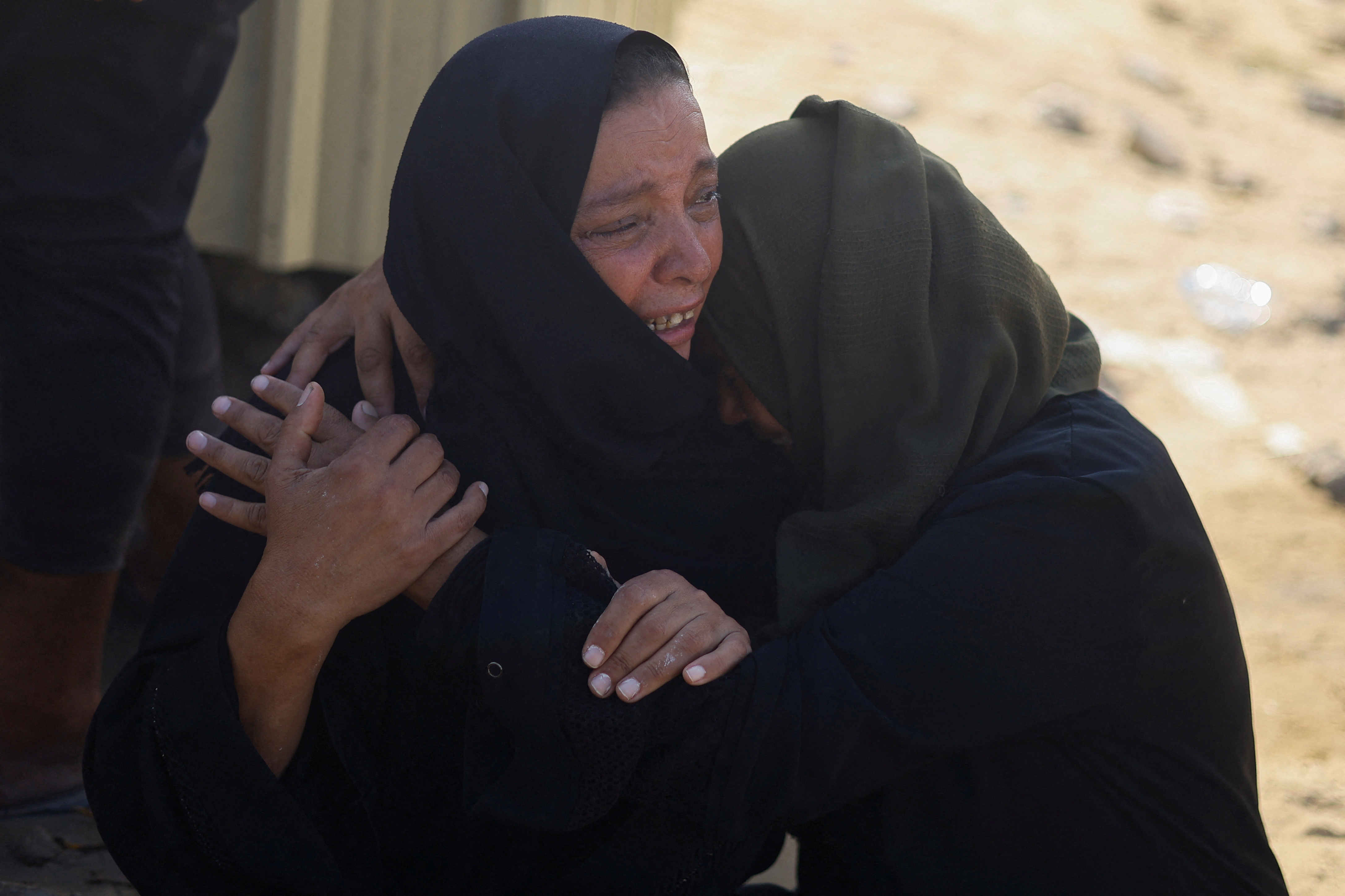 项目1共2项 FLE照片:在以色列袭击中遇难的巴勒斯坦人的葬礼上,哀悼者相拥而泣,地点在加沙地带南部的哈农尤尼斯的纳赛尔医院,2024年7月24日。路透社/穆罕默德·萨利姆/档案照片