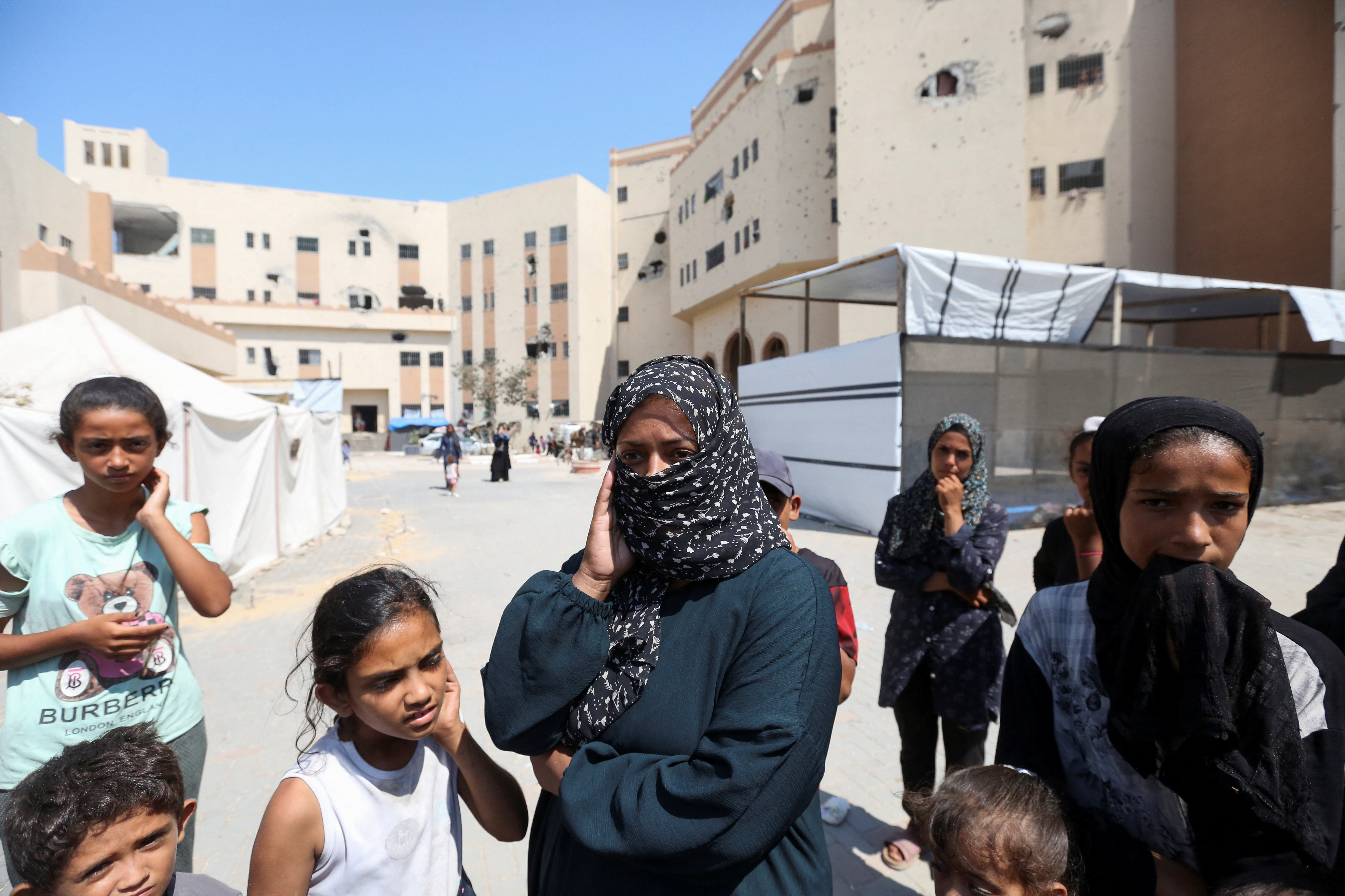 第1项,由于以色列的打击而逃离家园的巴勒斯坦人,他们在南加沙地带汗尤尼斯市,于2024年7月24日躲避冲突中向外张望。路透社/哈特姆·哈立德/文件照片