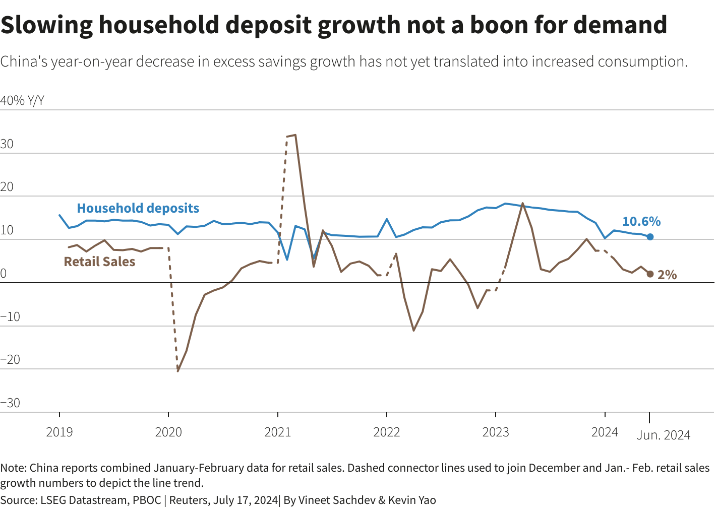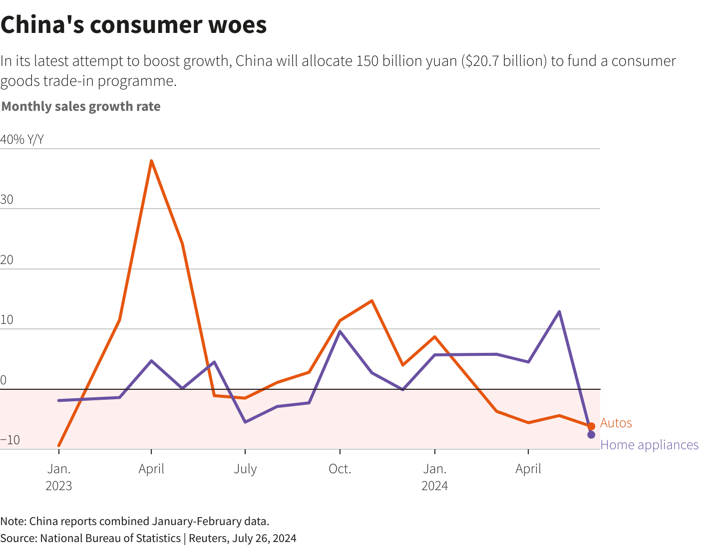 然而,发生的情况是,较大的工业产能导致了价格战和一场削减成本的竞赛,使工资保持低迷,助长了就业不确定性,并加剧了消费者因房地产行业下滑而造成的痛苦。.中国的经济未能达到增长预期,在第二季度保持在通缩的状态中,零售销售和进口显著低于工业产出和出口。中国在三月份启动了消费者以旧换新计划,但北京之前让资金紧张的地方政府来资助,结果并不理想。自三月份以来分配的总资金尚不清楚,但六月份的家电销售比去年下降了7.6%,汽车销售下降了6.2%。