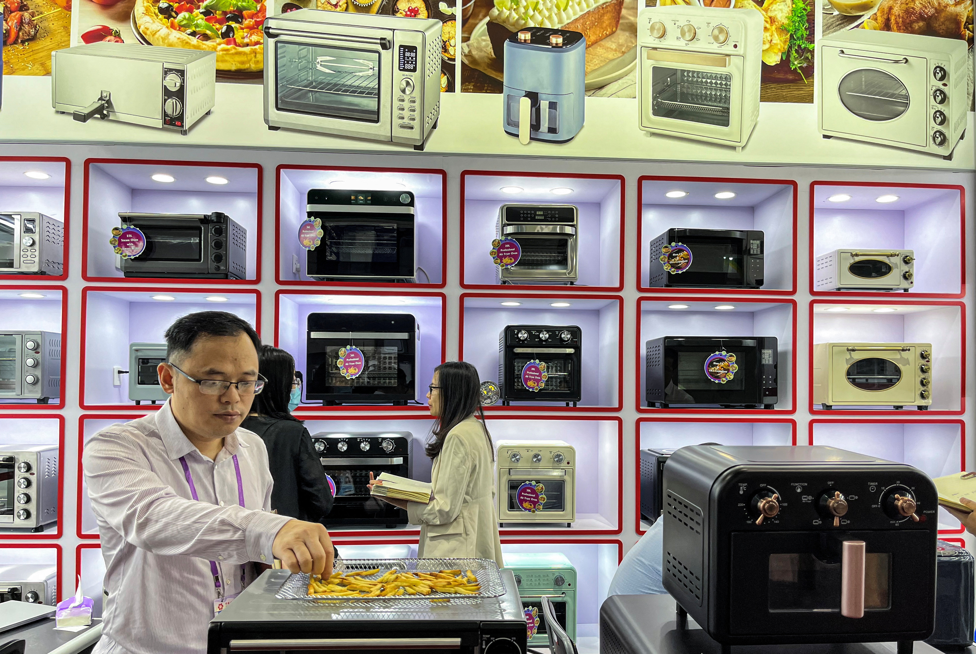 项目 1 共 3 项 一名工作人员在中国广州市的中国进出口博览会(也称为广交会)上的一家烤箱零售商处接待访客,时间为2023年4月16日。路透社/艾伦·张/档案照片