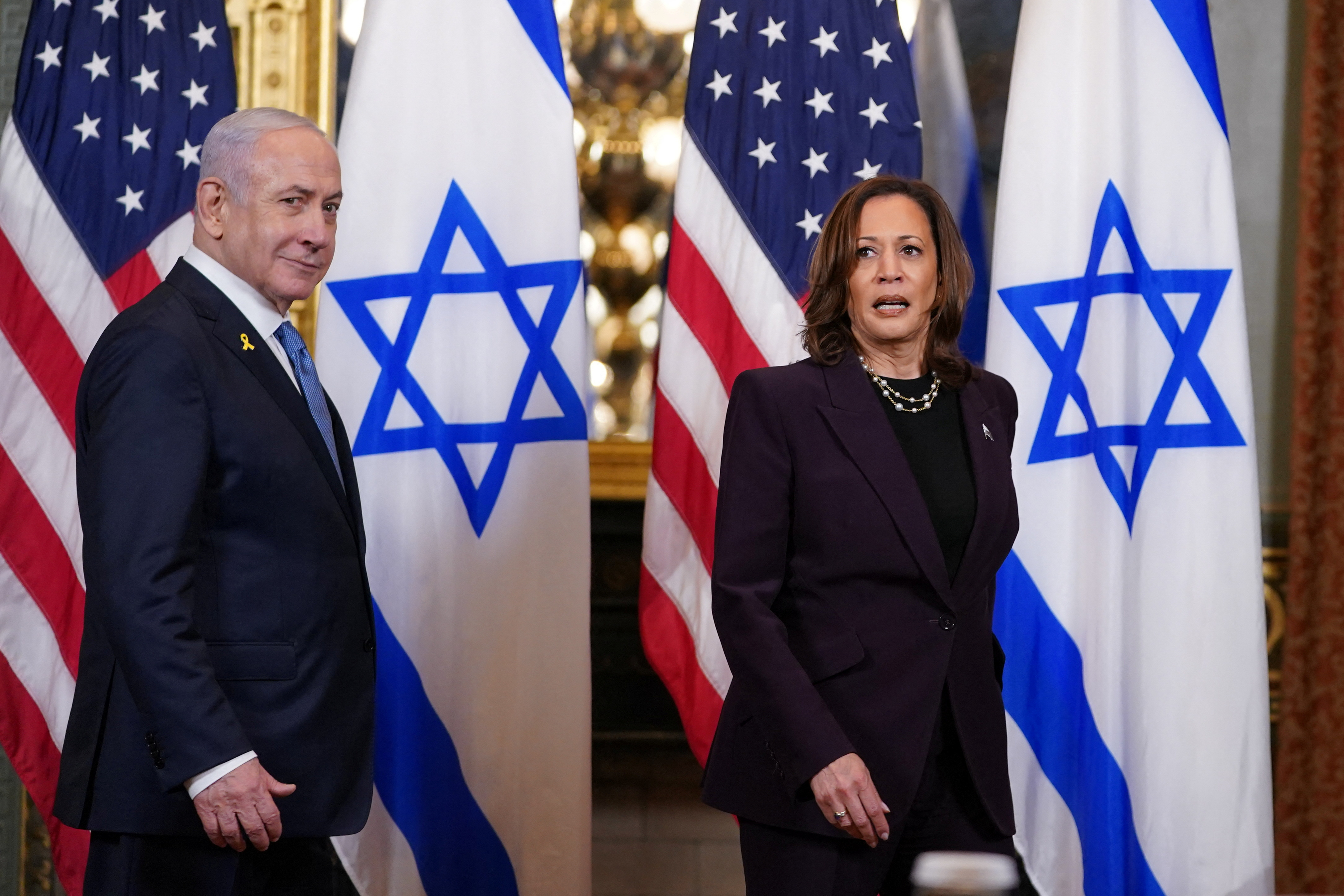 美国副总统卡马拉·哈里斯于2024年7月25日在华盛顿特区白宫内艾森豪威尔行政办公大楼与以色列总理本杰明·内塔尼亚胡会面,REUTERS/内森·霍华德
