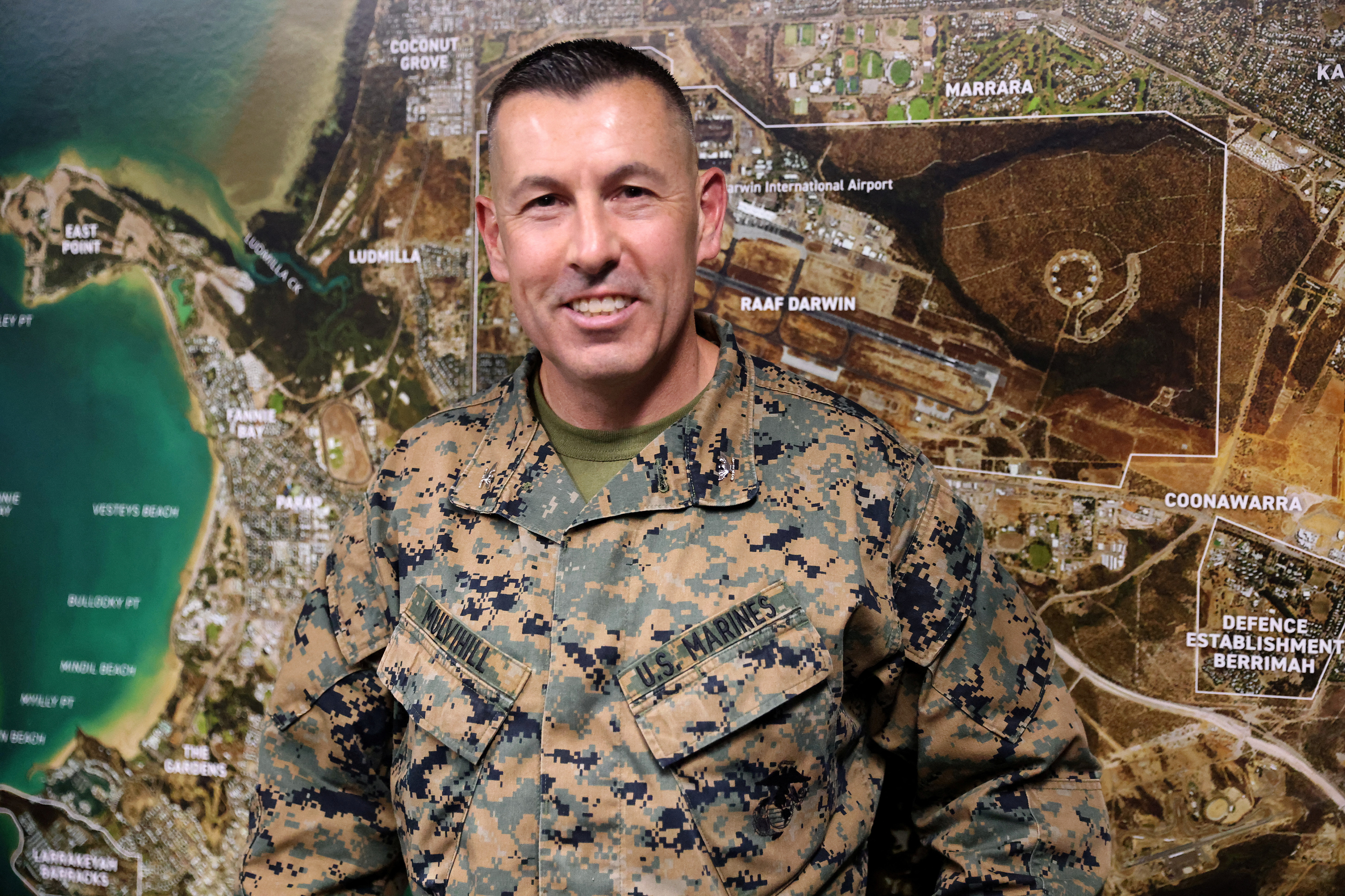 美国海军陆战队轮换部队指挥官布赖恩·穆尔维希尔上校于2024年7月16日在澳大利亚达尔文的拉拉基亚兵营拍照。路透社/克尔斯蒂·尼德汉穆尔维希尔表示,2011年与澳大利亚达成的协议使美国海军陆战队能够在达尔文进行临时训练,已演变为每年约2000名海军陆战队员的地区威慑角色。本月的战争游戏包括来自菲律宾和东帝汶的部队。
