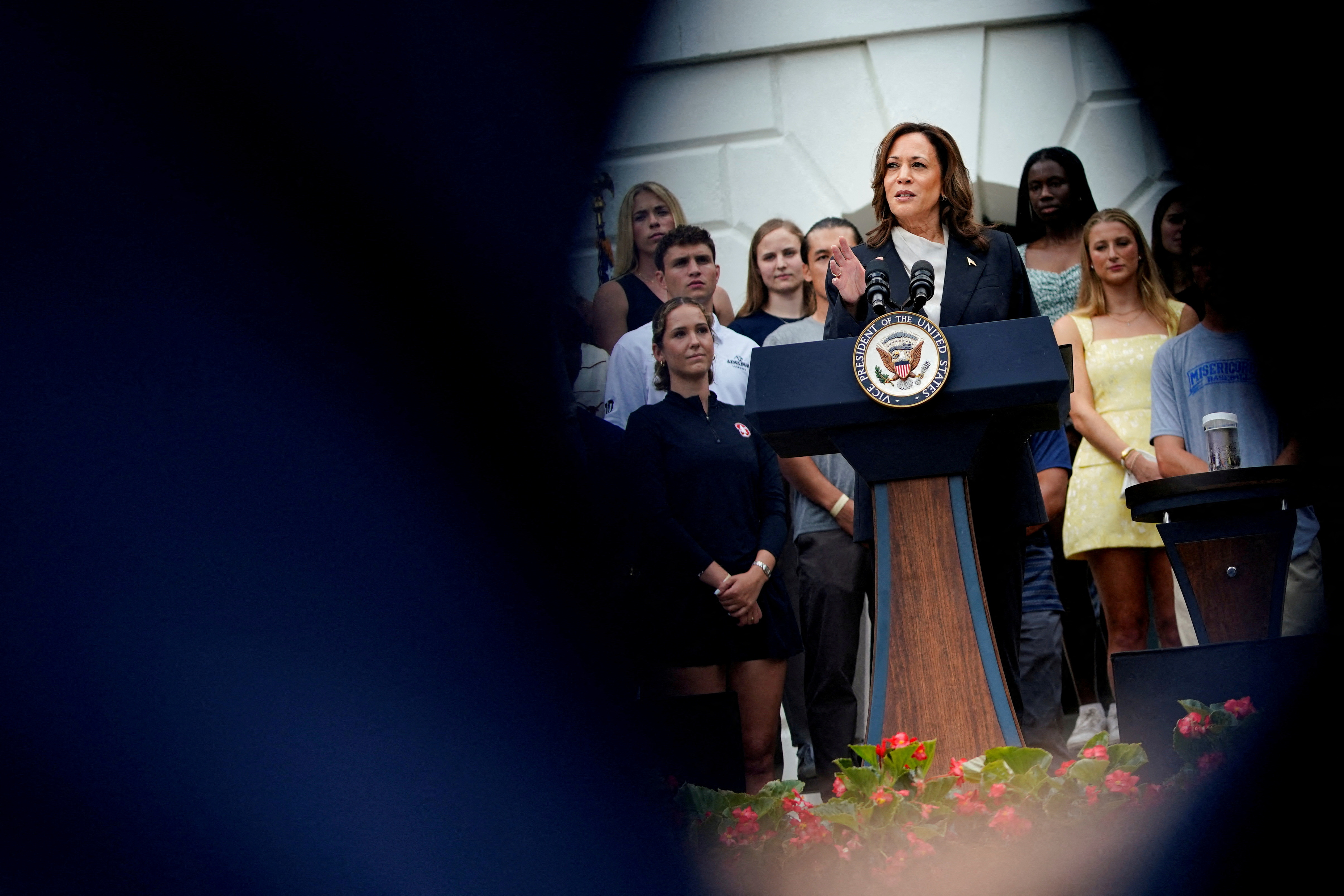 第1项2项美国副总统卡玛拉·哈里斯在白宫南草坪向女子和男子全国大学体育协会(NCAA)冠军团队发表讲话,这是自总统乔·拜登退出2024年竞选以来的首次公开露面,2024年7月22日,美国华盛顿。路透社/纳撒尼尔·霍华德/文件照片