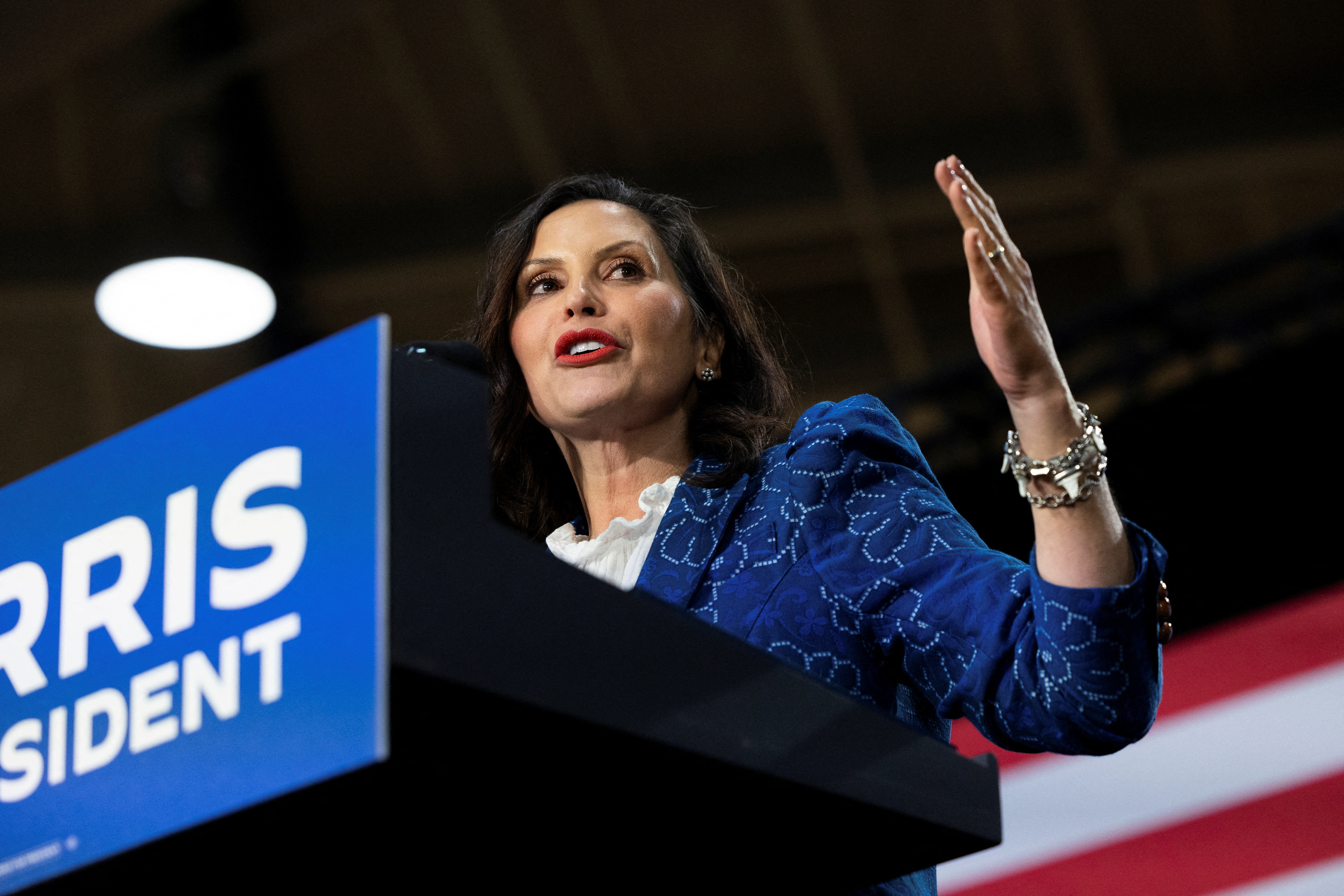 密歇根州州长格雷琴·惠特默(Gretchen Whitmer)在宾夕法尼亚州安布勒市(Ambler, Pennsylvania)的一次集会上发言,该集会是为了支持美国副总统卡玛拉·哈里斯(Kamala Harris)的民主党总统竞选活动,时间是2024年7月29日。路透社/拉切尔·维斯涅夫斯基(REUTERS/Rachel Wisniewski)