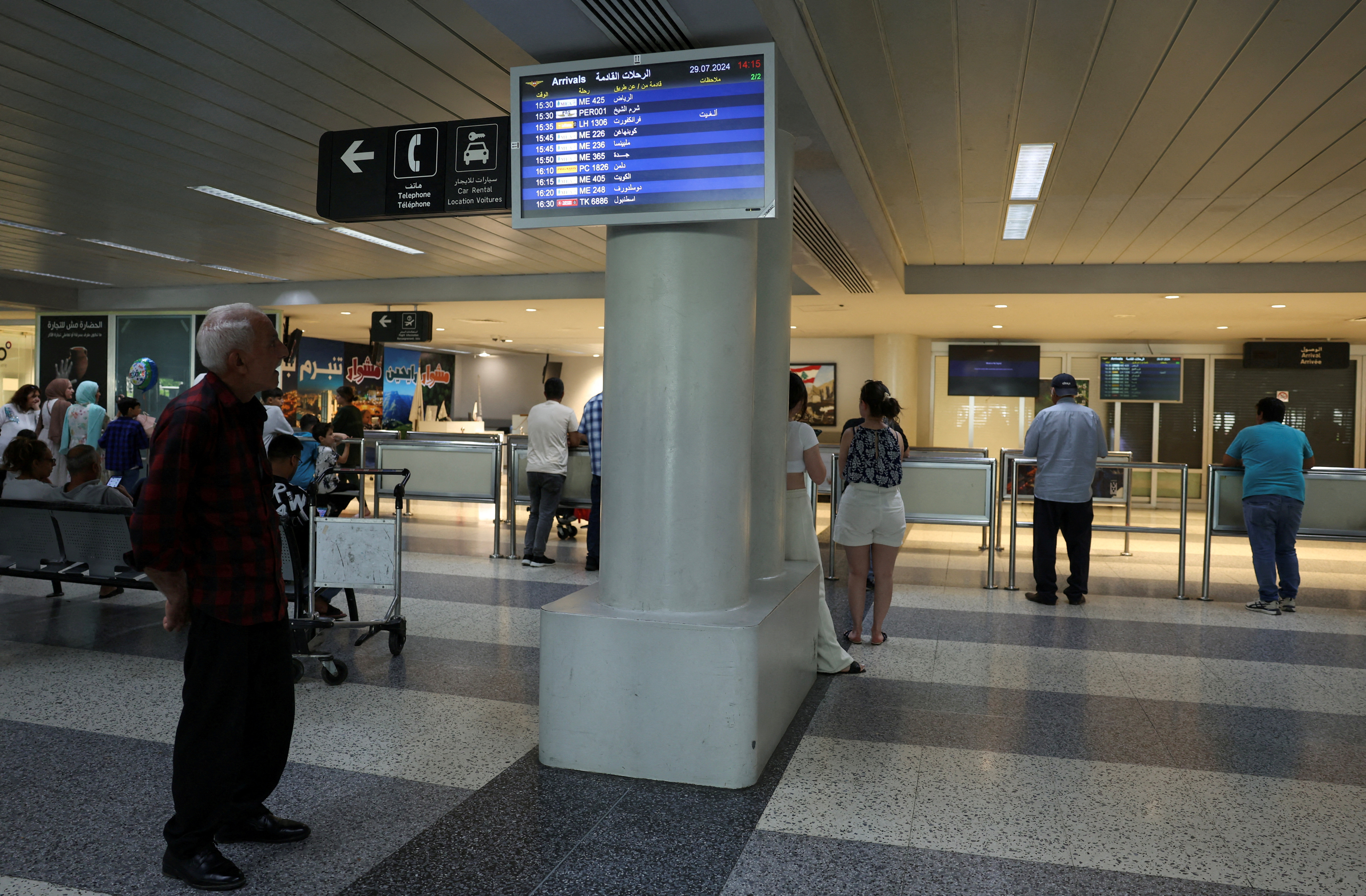 一名男子在黎巴嫩贝鲁特的贝鲁特–拉菲克·哈里里国际机场查看显示取消航班的航班信息板,时间是2024年7月29日。路透社/埃米莉·马迪7月30日(路透社) - 希腊的爱琴海航空和德国的康多尔航空在周二取消了前往贝鲁特的航班,这是最近暂停服务的航空公司,因为以色列与武装政治团体真主党之间的紧张局势升级。爱琴海航空表示将暂停航班直到周四,而康多尔航空取消了周二从杜塞尔多夫出发的航班。