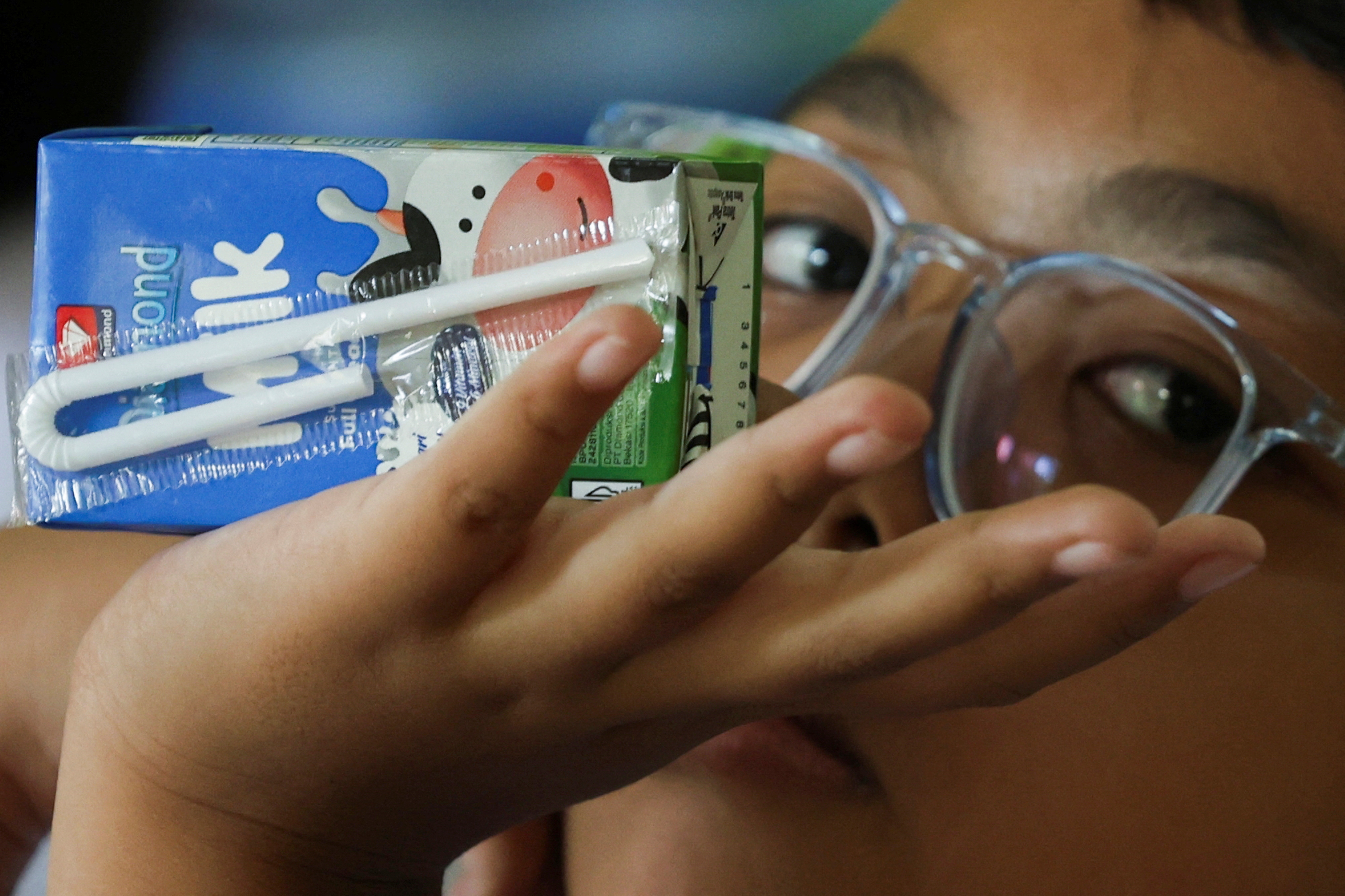 第1项,共5项 在印度尼西亚坦格朗的一所小学进行免费午餐项目试点时拍摄的牛奶盒,2024年8月5日。路透社/Ajeng Dinar Ulfiana