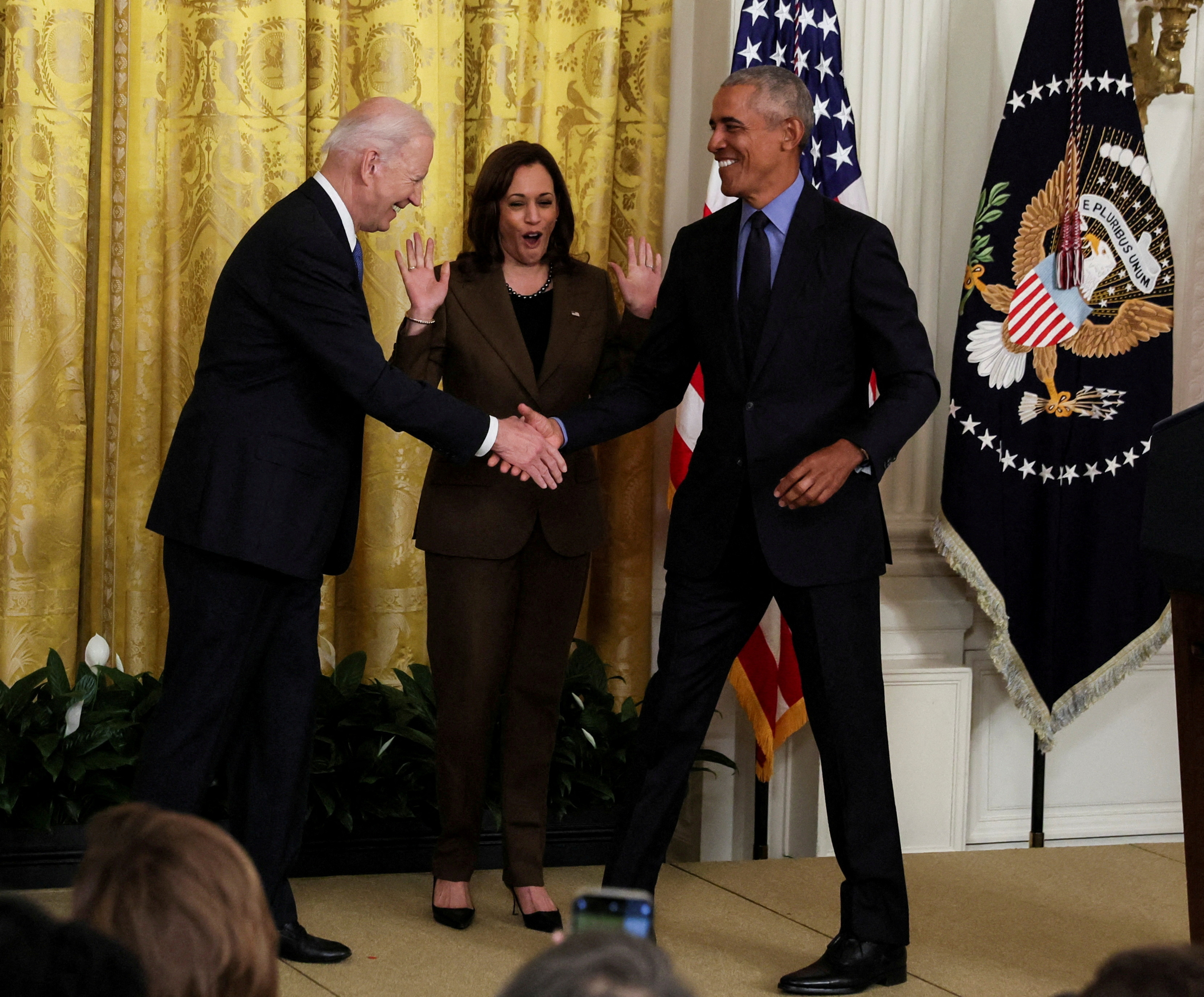 美国副总统卡马拉·哈里斯与前总统巴拉克·奥巴马在美国总统乔·拜登主持的关于《平价医疗法案》的活动中站在一起,这是奥巴马的主要立法成就,时间是2022年4月5日,地点在华盛顿白宫的东厅。路透社/利亚·米利斯/档案照片