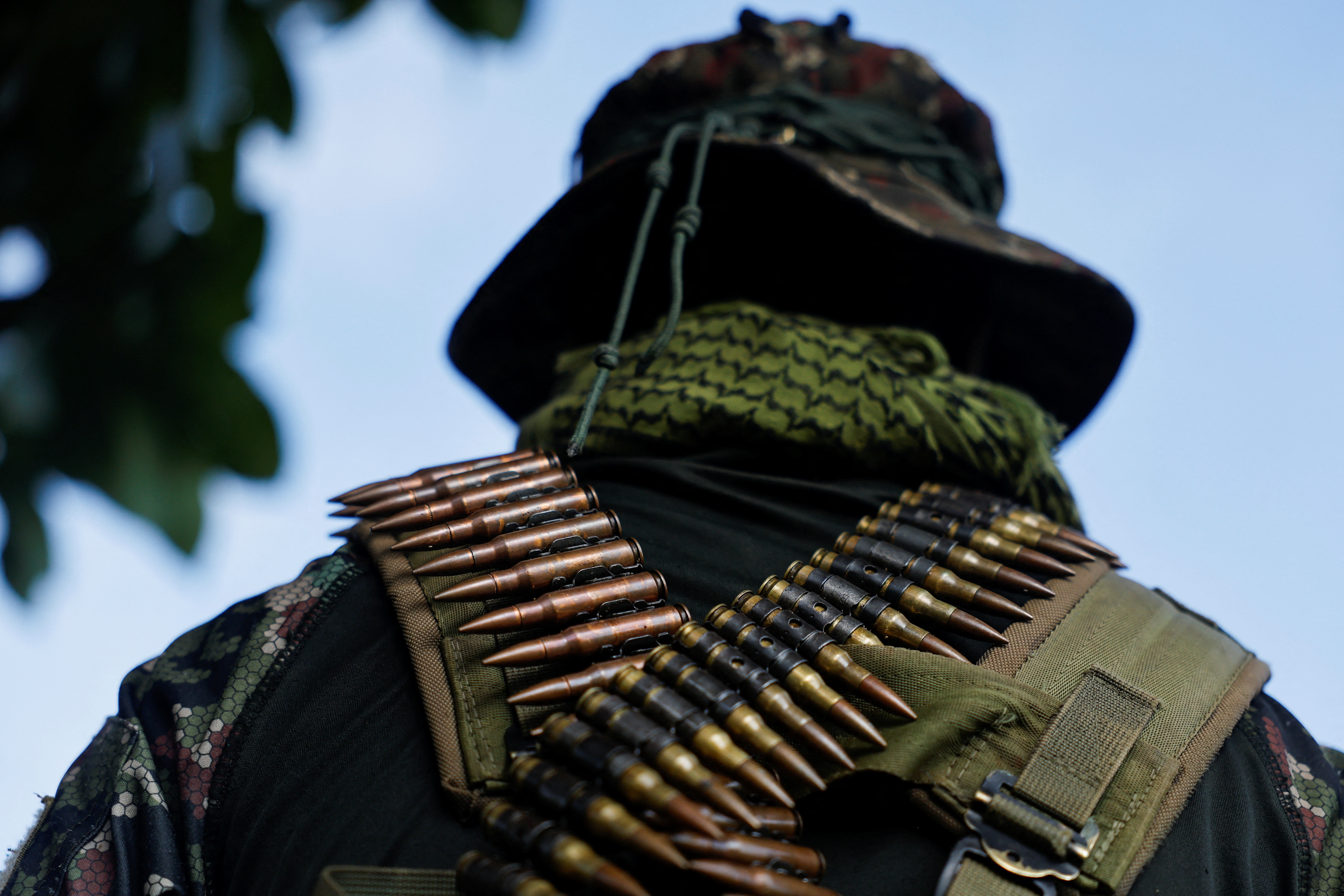 哥伦比亚叛军团体第二马尔凯塔利亚的游击队员在哥伦比亚太平洋丛林中巡逻前休息,2024年7月25日,路透社/丹尼尔·贝塞里尔## 结束武装