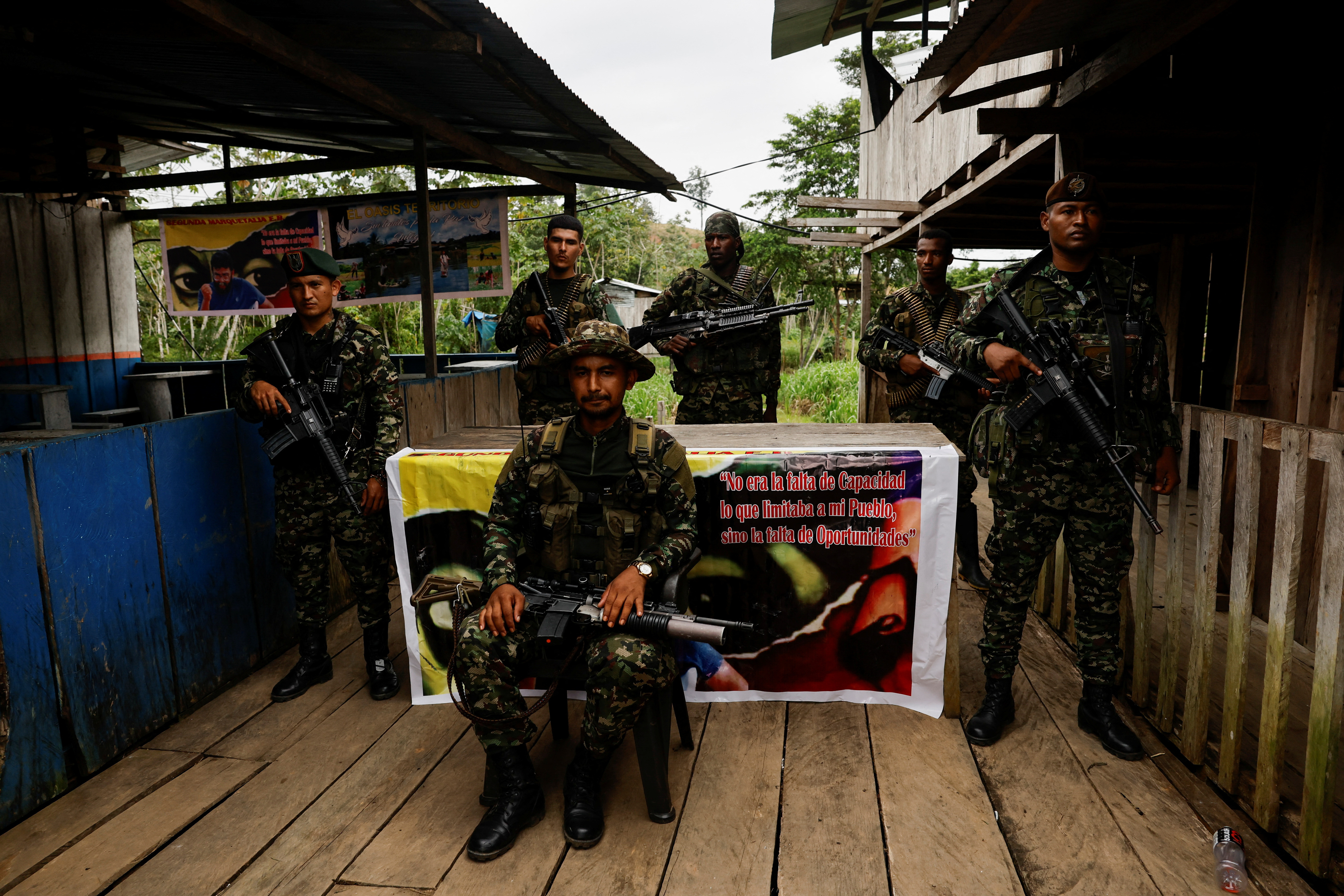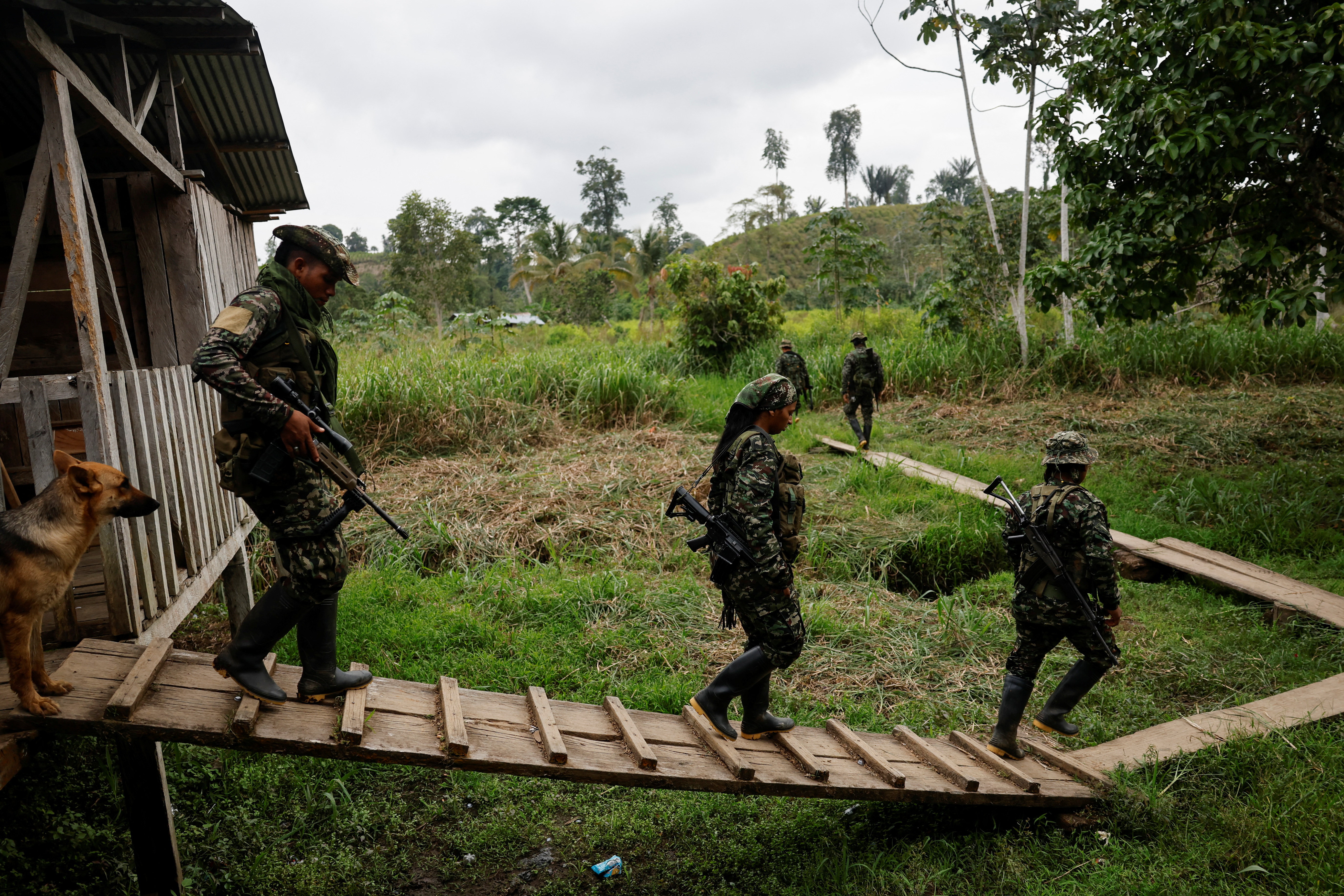 哥伦比亚反叛组织第二马尔凯塔利亚的游击队员在哥伦比亚太平洋丛林的一个基地营地巡逻,2024年7月25日。路透社/丹尼尔·贝塞里尔诺沃亚表示,政府同意需要打击贫困并投资于医疗保健和教育,但这种发展需要“结束非法武器的暴力。”