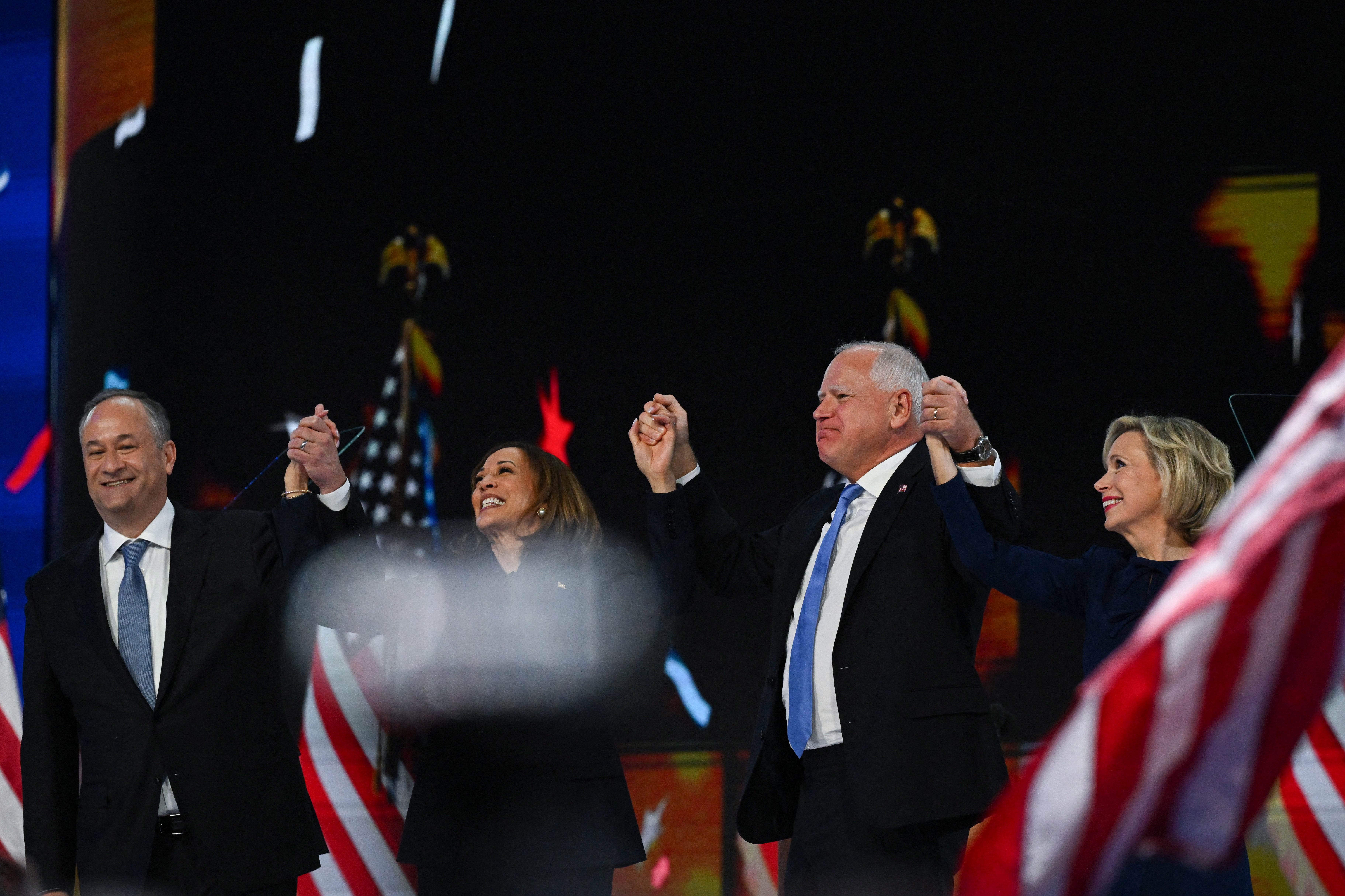 民主党总统候选人和美国副总统卡马拉·哈里斯,她的丈夫道格·埃姆霍夫,民主党副总统候选人明尼苏达州州长蒂姆·沃尔兹及其妻子格温在2024年8月22日美国伊利诺伊州芝加哥的联合中心民主党全国大会(DNC)第四天的舞台上站着。路透社/卡拉汉…阅读更多芝加哥,8月23日(路透社) - 在本周的民主党全国大会上,总统候选人卡马拉·哈里斯的高级政策顾问布赖恩·尼尔森在圆桌讨论中被问及她竞选核心政策的问题。