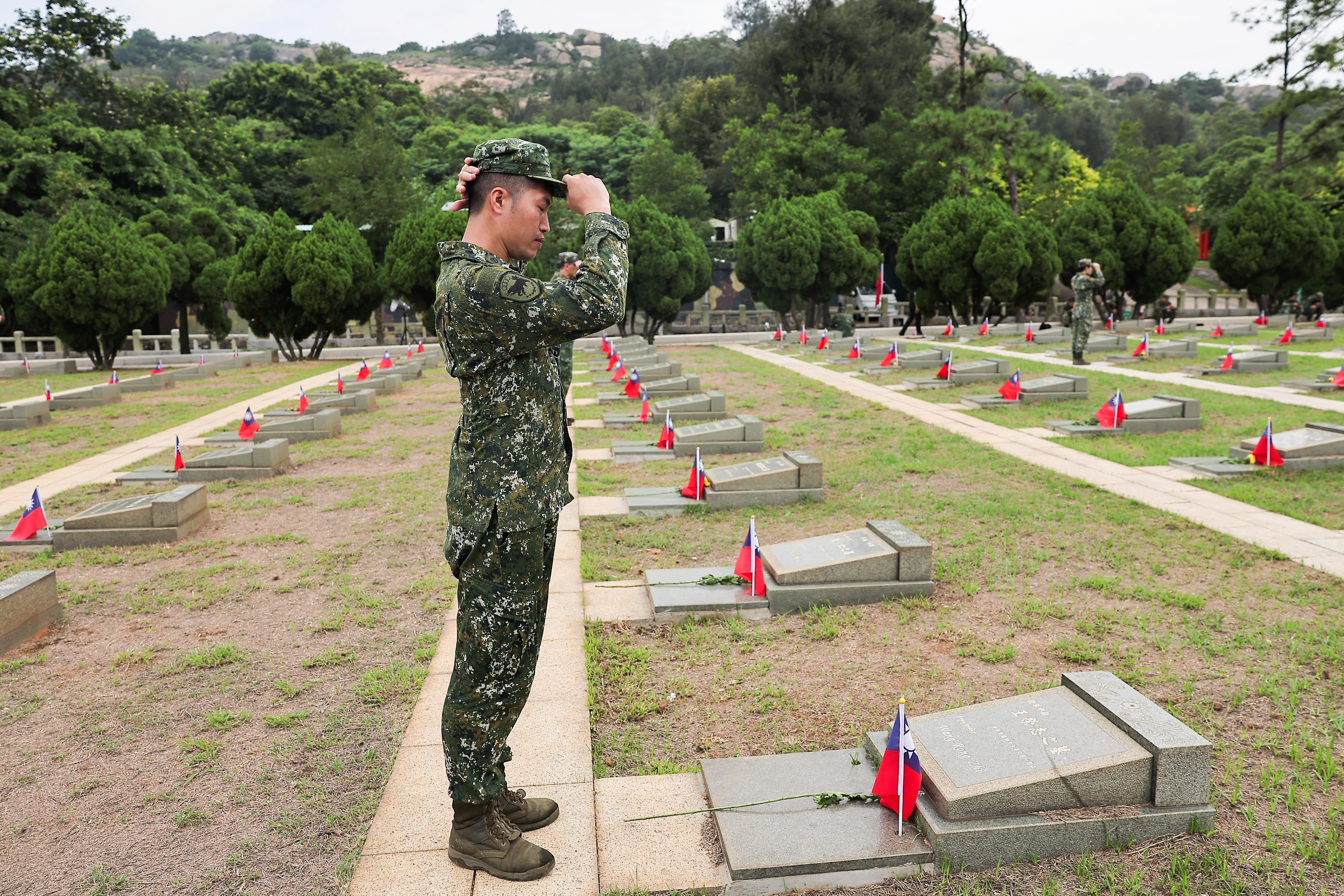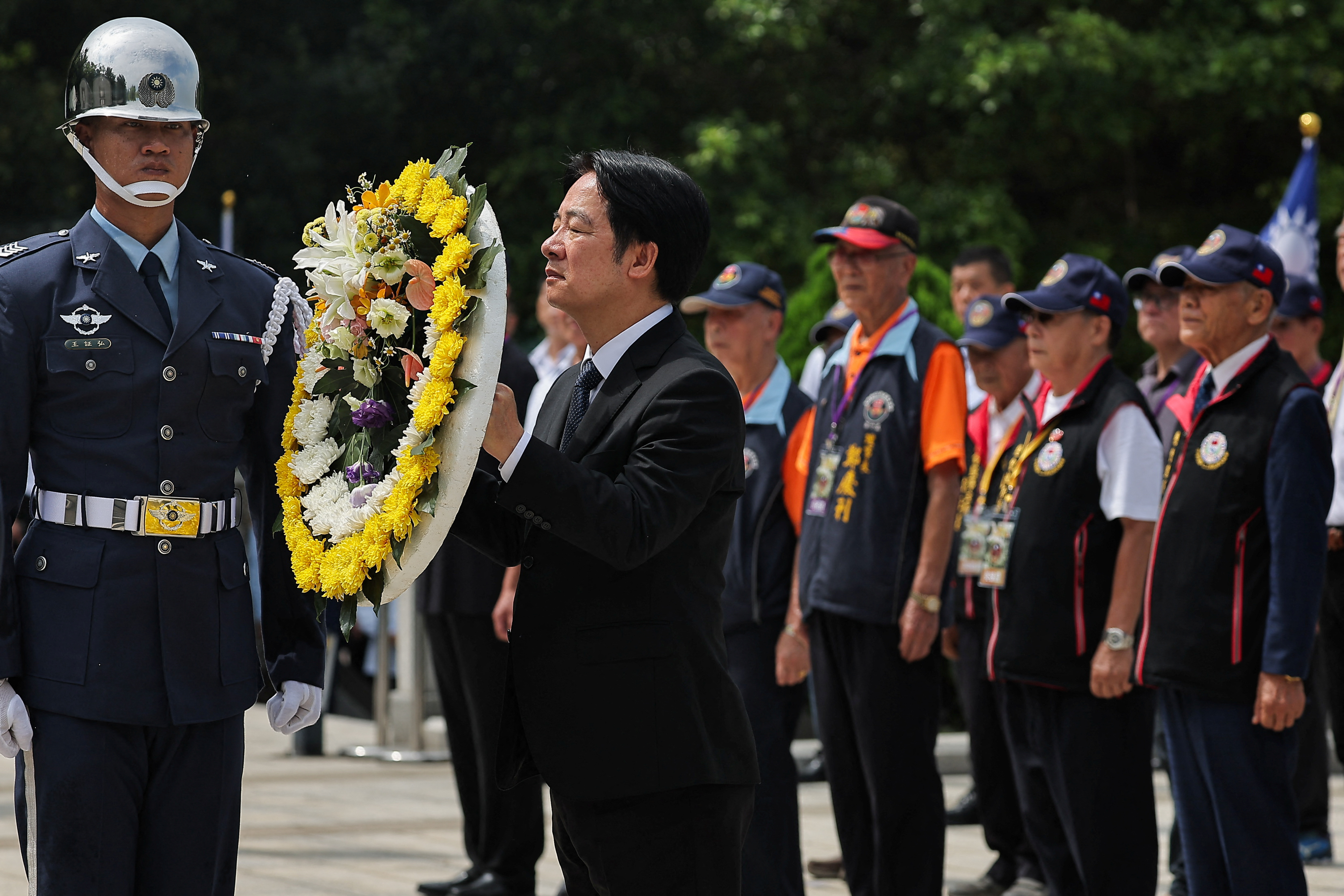 第1项,共5项 台湾总统赖清德在金门前线岛屿举行的纪念抗击中国军队的仪式上致敬,2024年8月23日。路透社/安王
