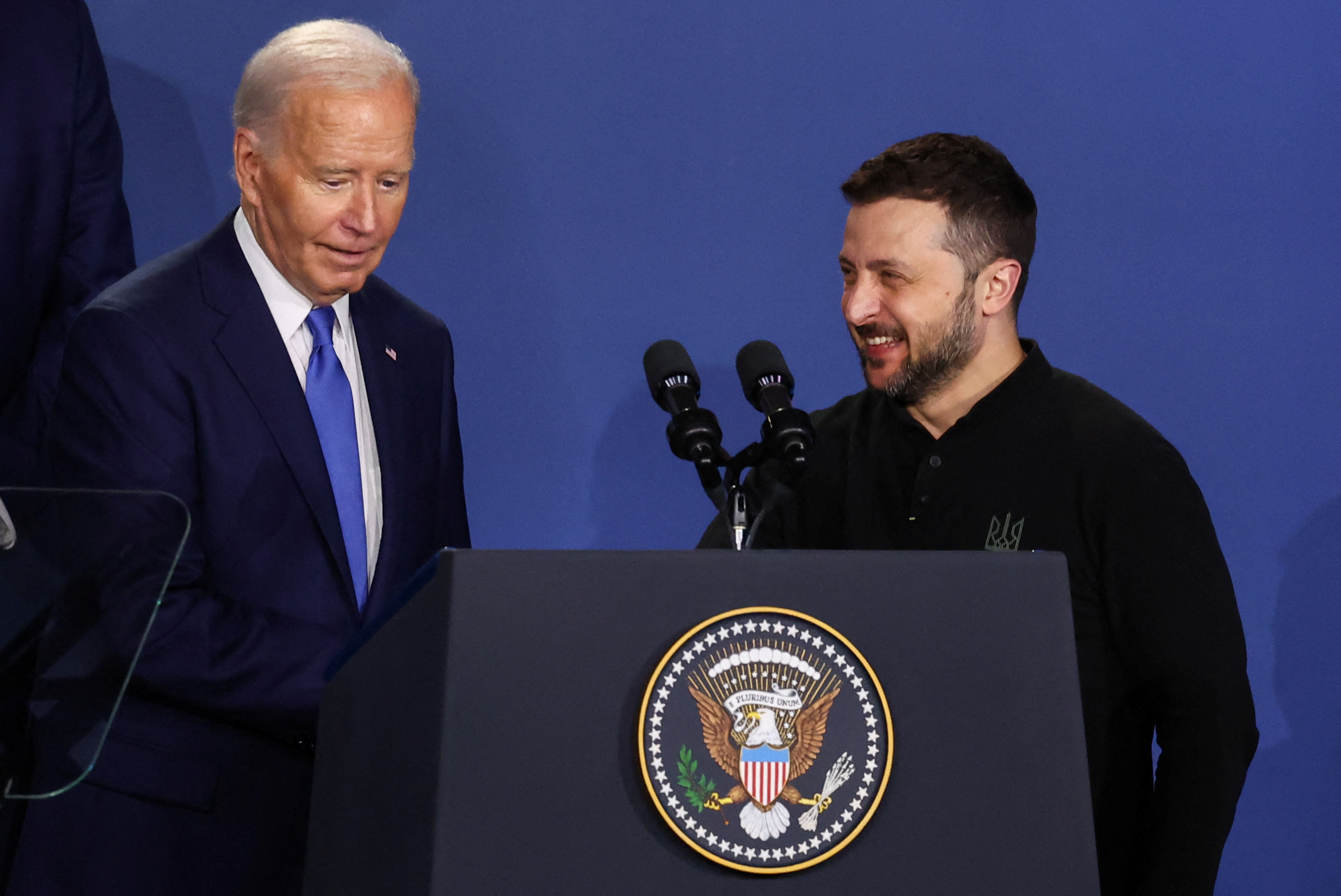 乌克兰总统弗拉基米尔·泽连斯基和美国总统乔·拜登在美国华盛顿参加北约75周年峰会期间的乌克兰紧急会议时作出反应,时间是2024年7月11日。路透社/伊夫·赫尔曼/档案照片华盛顿,8月23日(路透社) - 美国总统乔·拜登在周五与乌克兰总统弗拉基米尔·泽连斯基通话,并宣布了一项新的军事援助计划,以迎接周六的乌克兰独立日,他们的办公室表示。