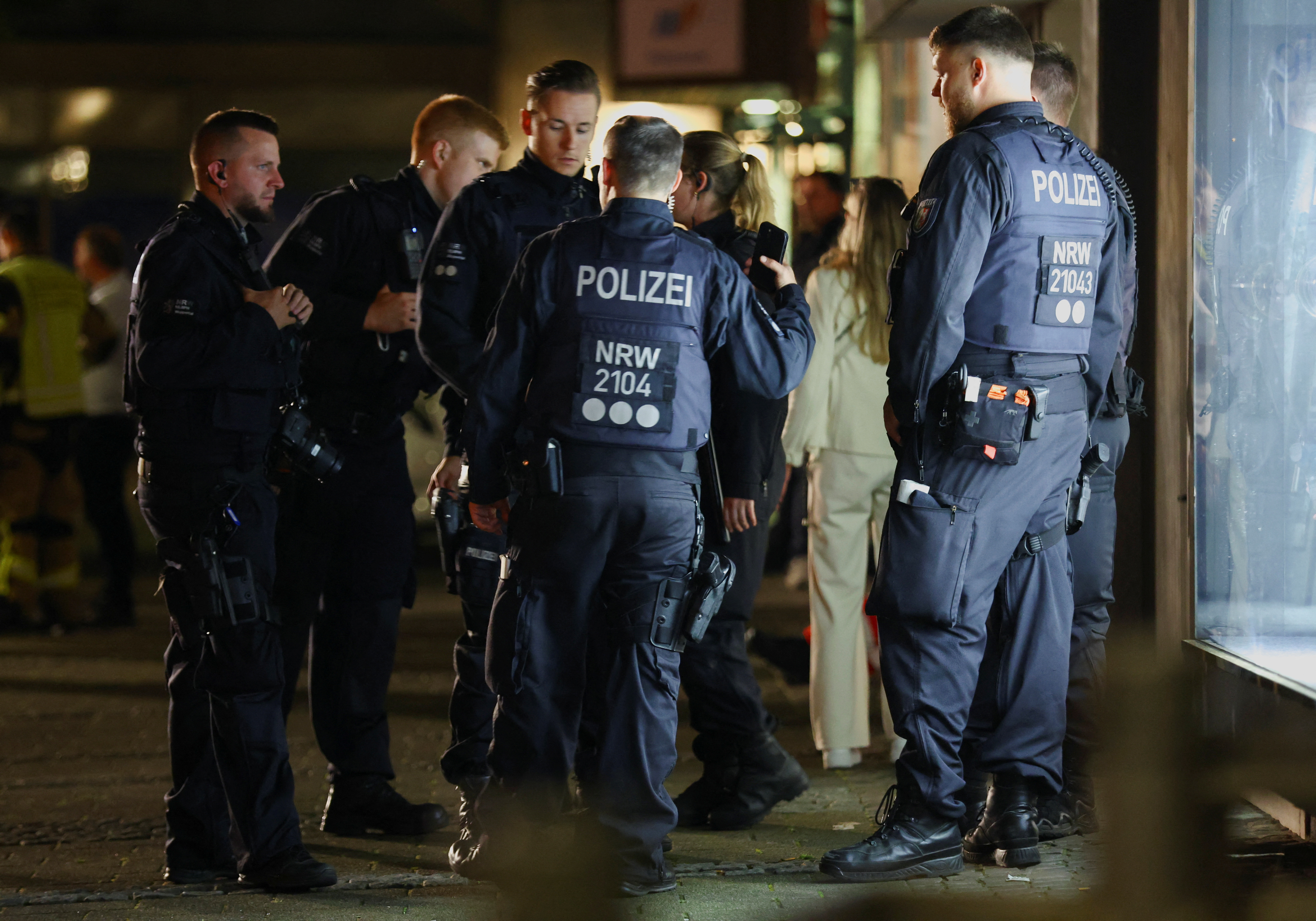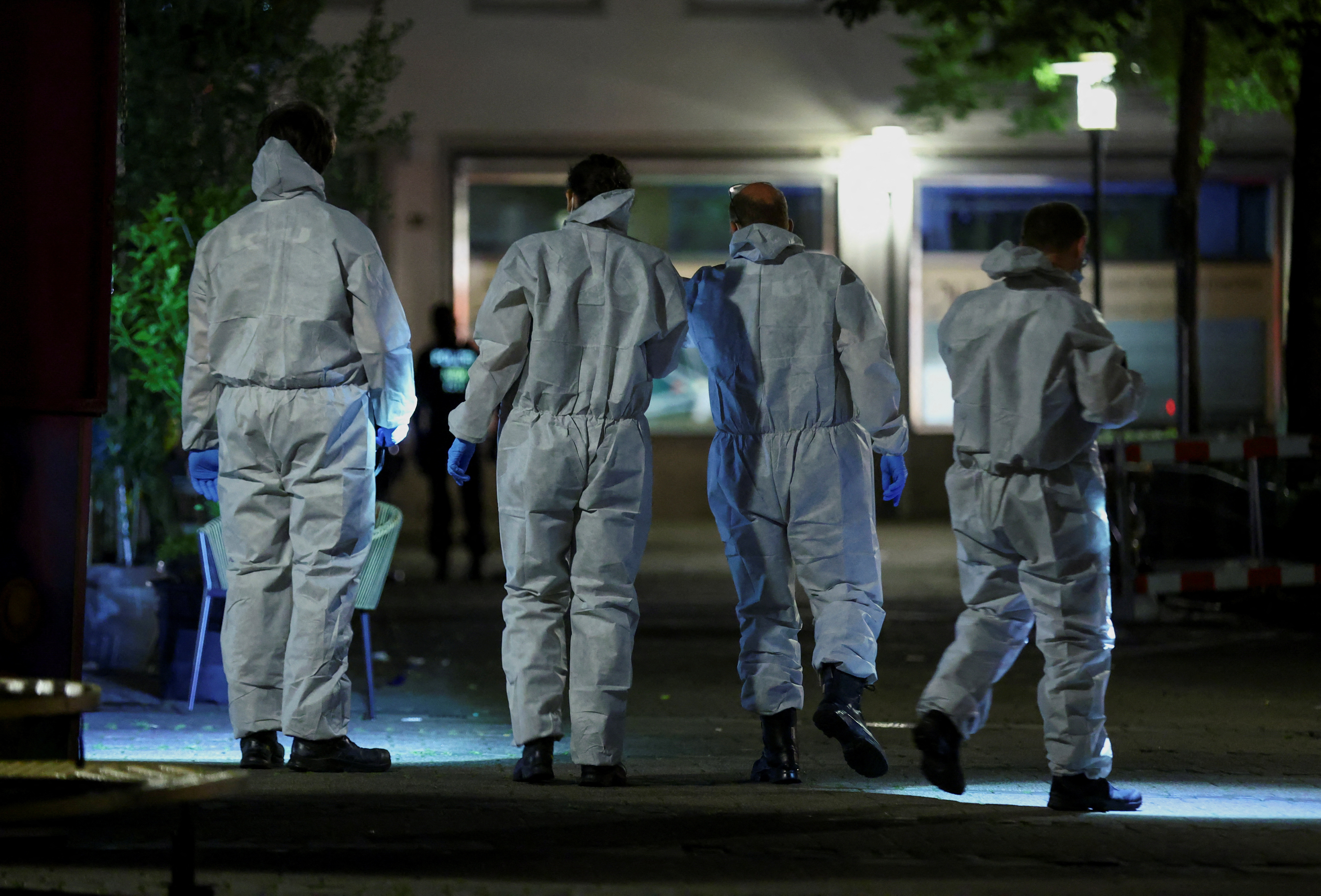 第1项,共7项 警方成员和法医专家在一起事件后工作,事件中几名个人在周五晚上被一名男子在城市节日上随机用刀刺伤,地点在德国索林根,2024年8月24日。路透社/蒂洛·施穆尔根