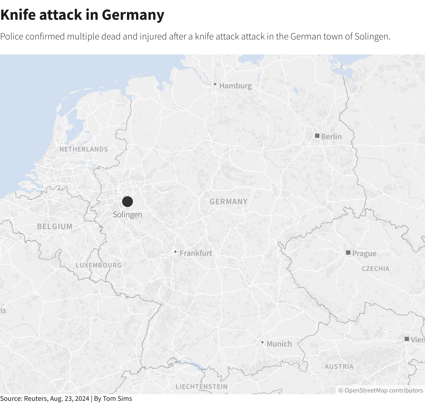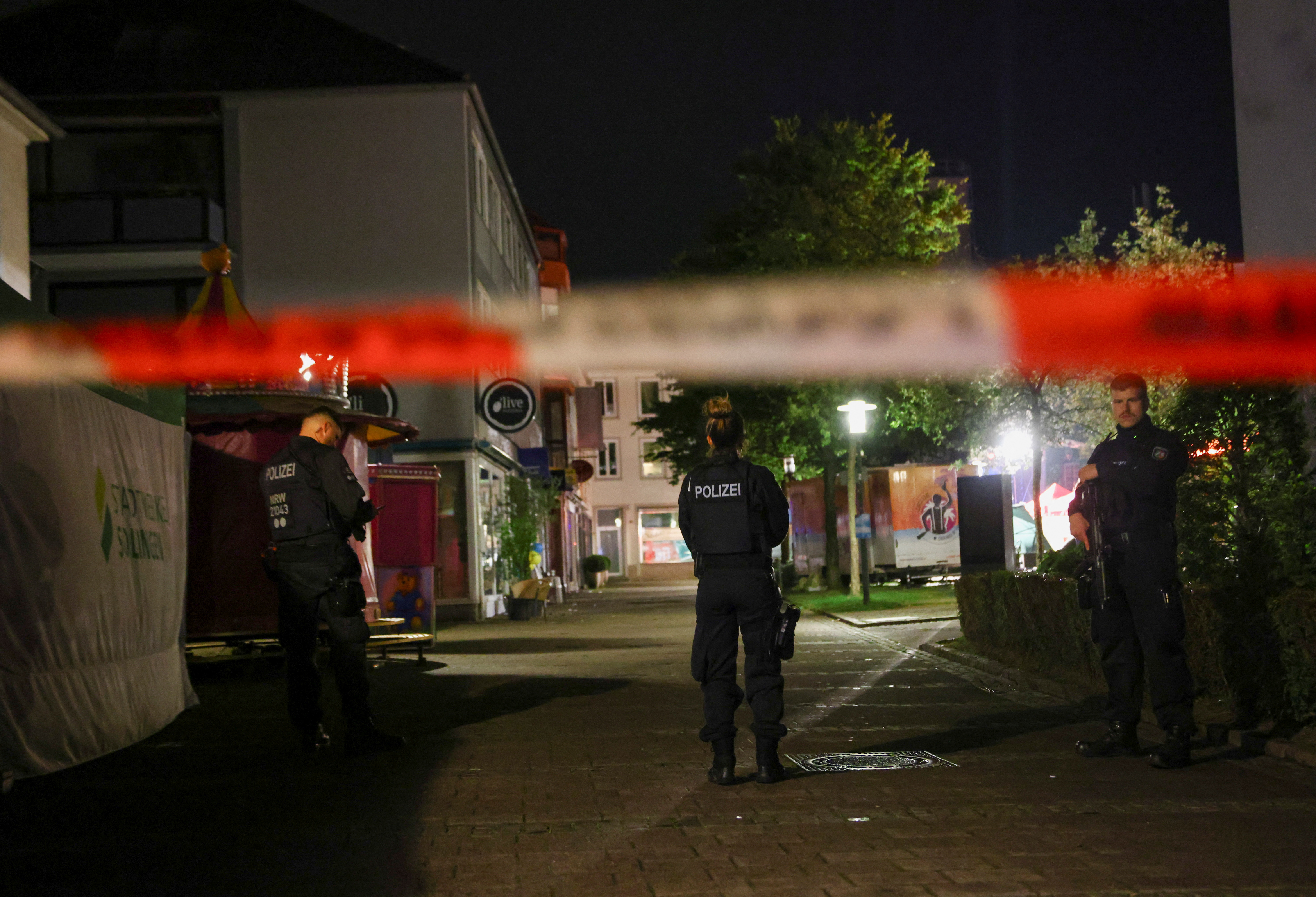 警方成员和法医专家在一起事件后工作,事件中几名个人在周五晚上被一名男子在城市节日上随机用刀刺伤,地点在德国索林根,2024年8月24日。路透社/蒂洛·施穆尔根袭击发生在Fronhof,一个位于索林根的市场广场,现场有现场乐队演出。这是在庆祝该市650周年的节日上,索林根位于与荷兰接壤的北莱茵-威斯特法伦州。