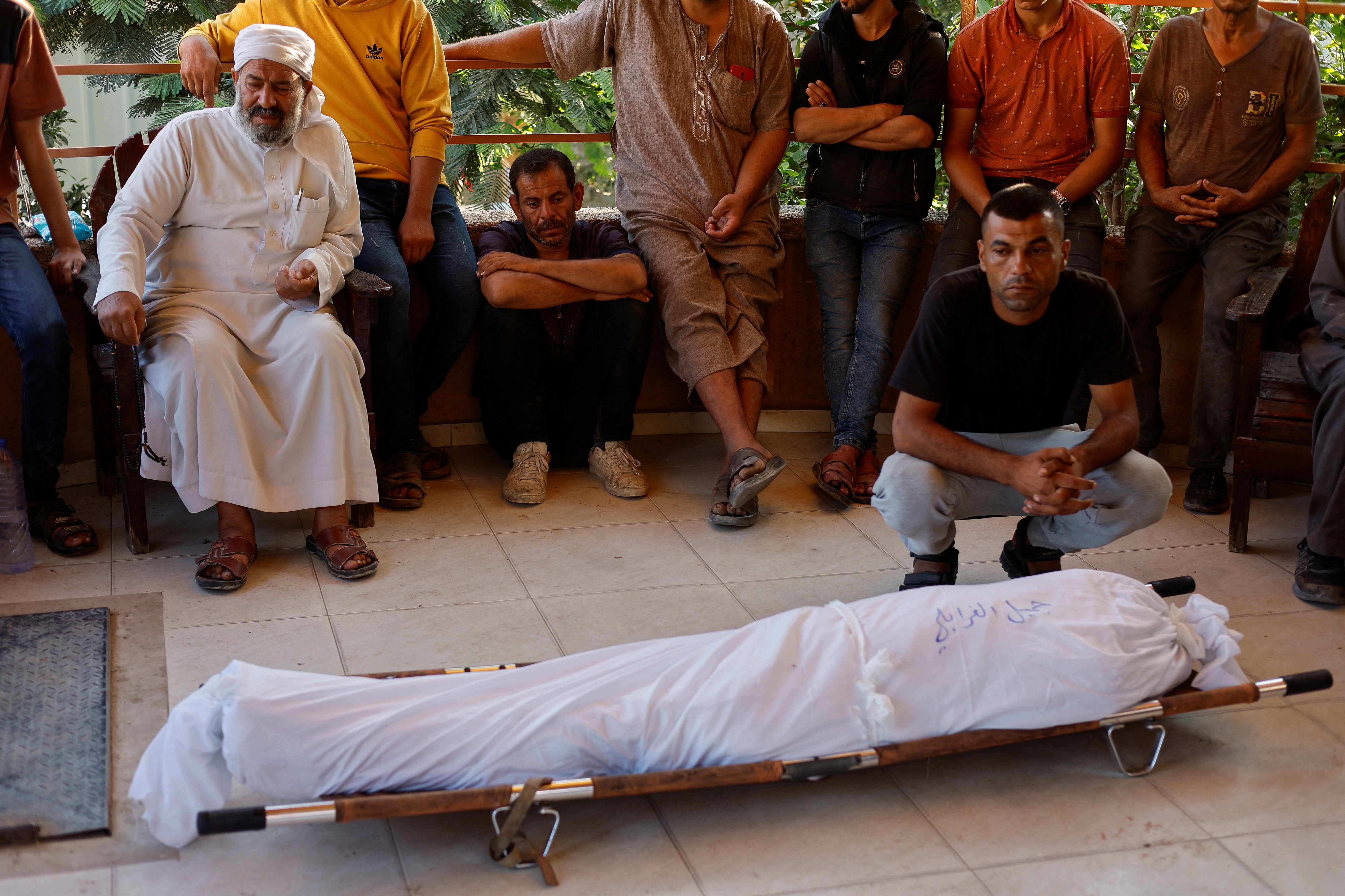三名哀悼者在以色列袭击中遇难的巴勒斯坦人葬礼上作出反应,地点在加沙地带南部的哈农斯医院,时间为2024年8月26日。路透社/穆罕默德·萨利姆
