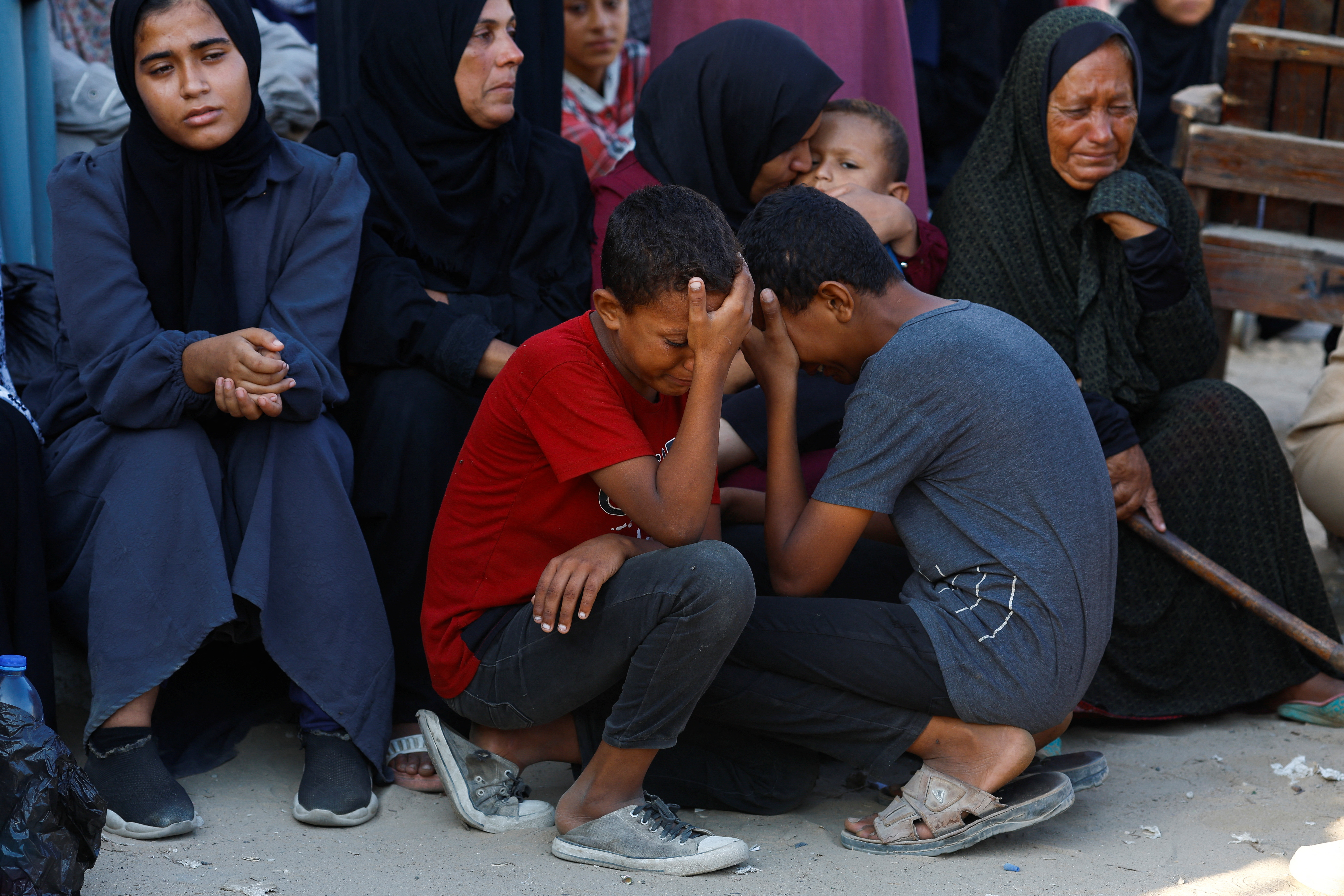 三名哀悼者在以色列袭击中遇难的巴勒斯坦人葬礼上作出反应,地点在加沙地带南部的哈农斯医院,时间为2024年8月26日。路透社/穆罕默德·萨利姆