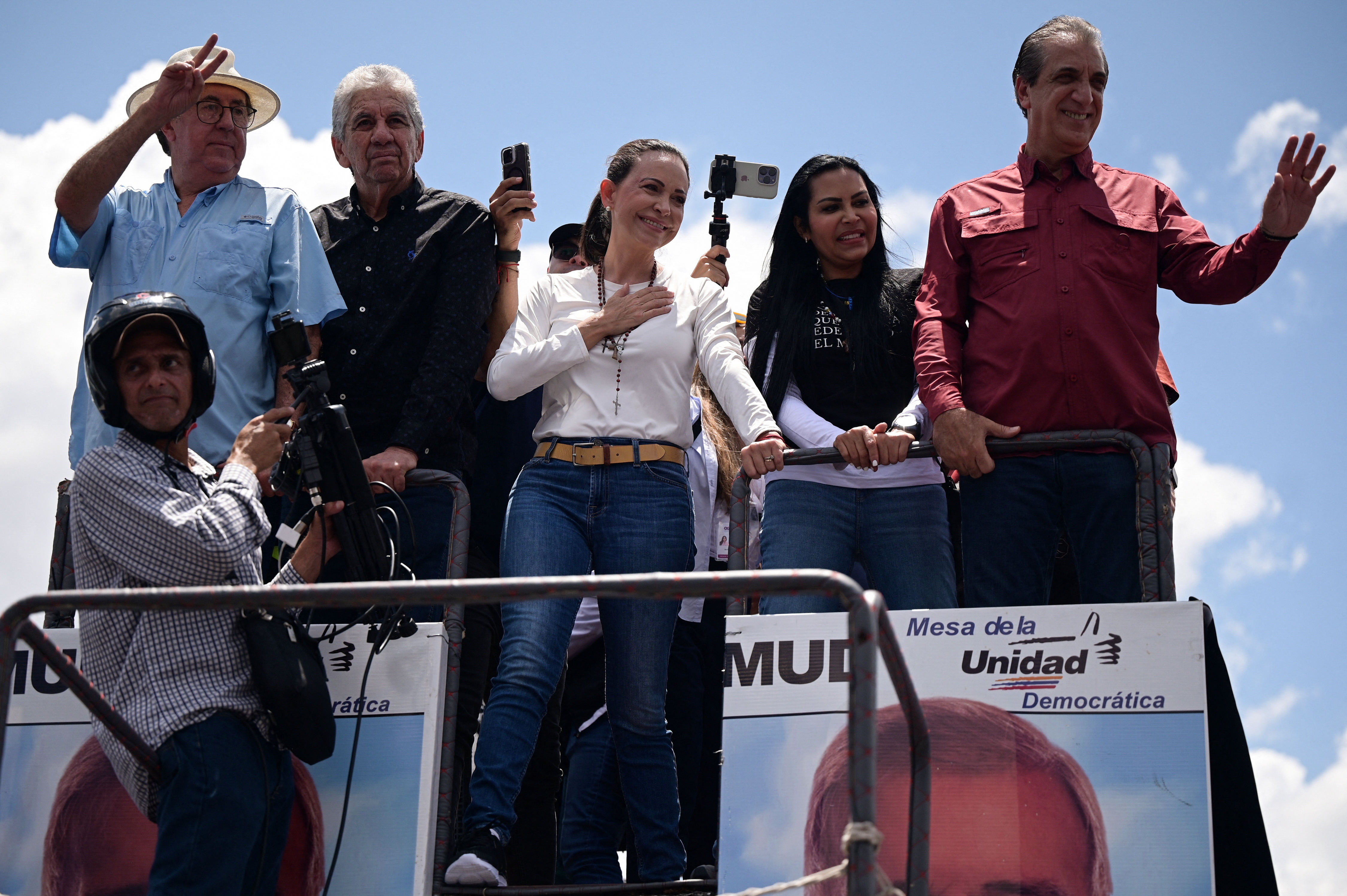 “内部和外部力量之间的协调将实现变革,”马查多通过视频通话表示,她在游行中出现,但自投票以来一直在躲藏。“马杜罗今天还剩下什么?一小部分高级军官,最高法院的法官控制,以及武器……他在播种恐惧。”