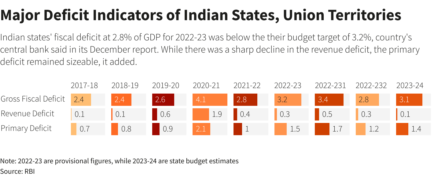 他最近撤回了在房地产销售中减少某些税收优惠的决定,因中产阶级的强烈反对,并推出了一项 联邦政府雇员养老金计划,预计本财政年度将使国库支出约625亿印度卢比(7.45亿美元)。政府将个人基本工资的缴费比例从14%提高到18.5%。最近宣布的五个州的预算,包括马哈拉施特拉邦和其他由印度人民党统治的州,如中央邦、奥里萨邦和拉贾斯坦邦,平均财政赤字已达到州GDP的3.2%,比今年早些时候的临时预算高出20个基点,这主要是由于它们在民生措施上的收入支出增加,来自Elara Securities的报告称。
