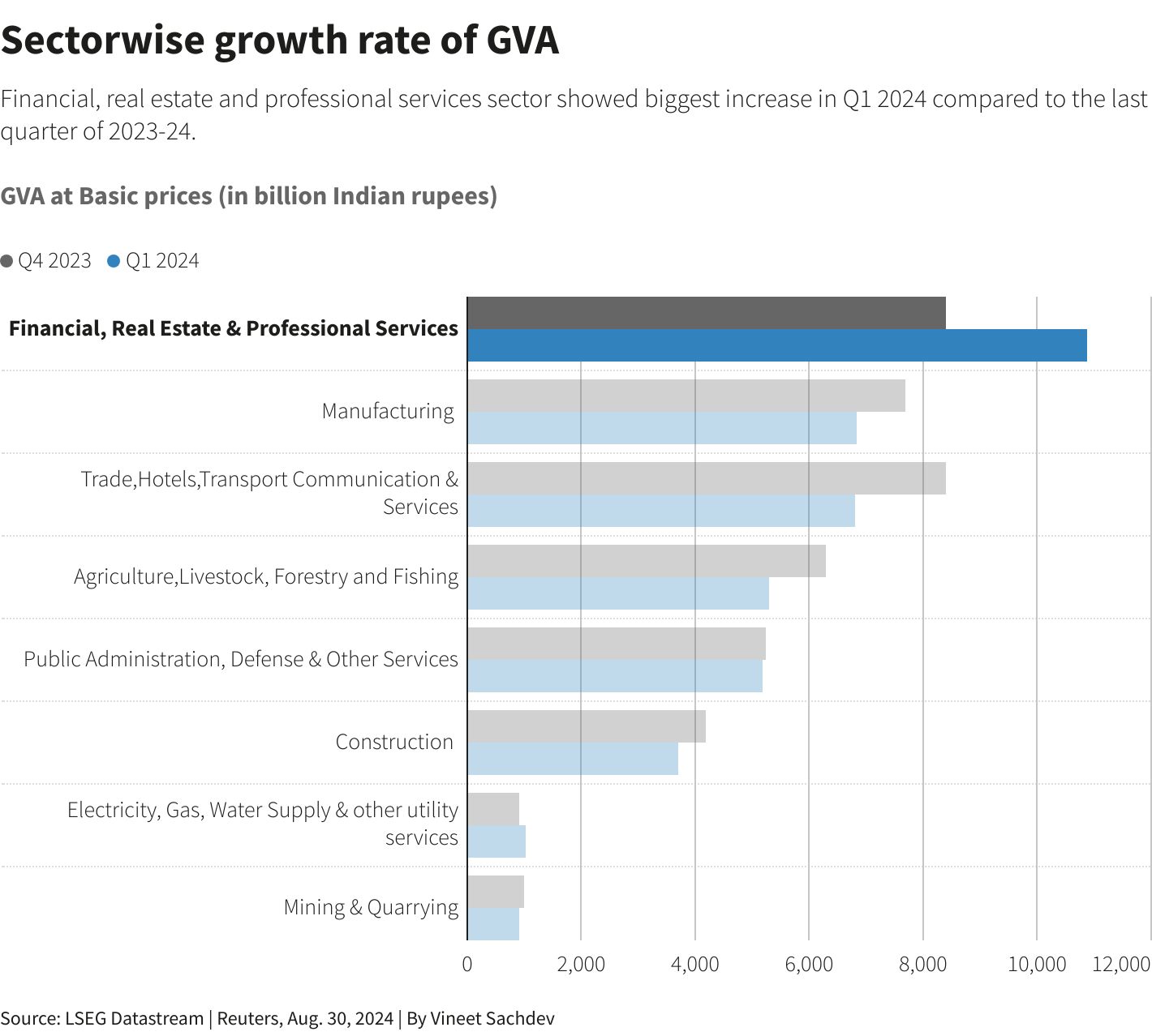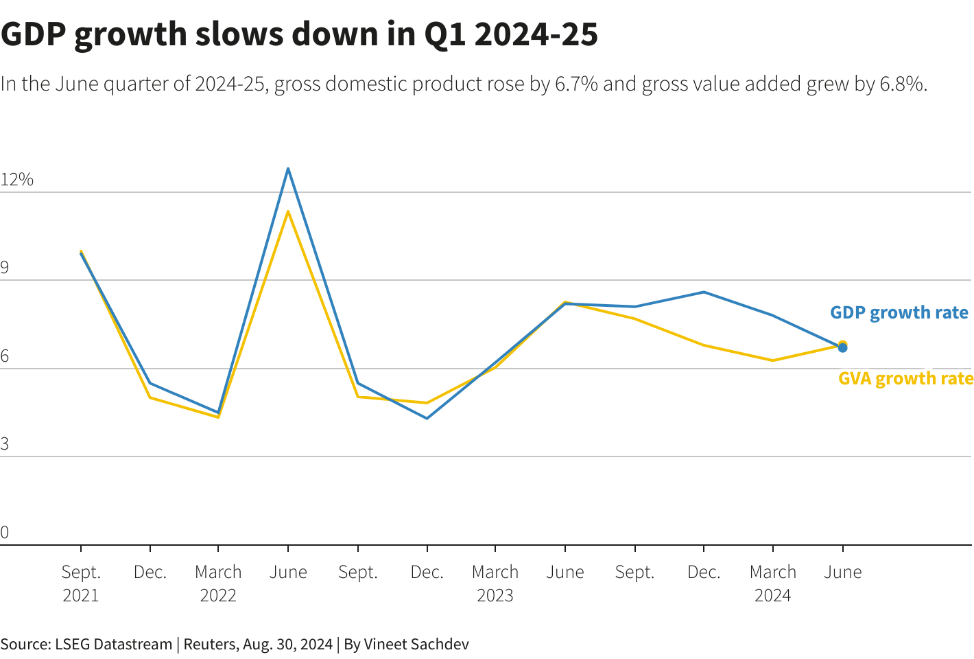 高层建筑在印度孟买被看到,2024年1月5日。路透社/弗朗西斯·马斯卡雷纳斯/档案照片新德里,8月30日(路透社) - 印度的经济增长在4月至6月季度放缓至同比6.7%,因为国家选举期间政府支出的减少造成了压力,数据显示周五公布,但它仍然是全球增长最快的主要经济体。