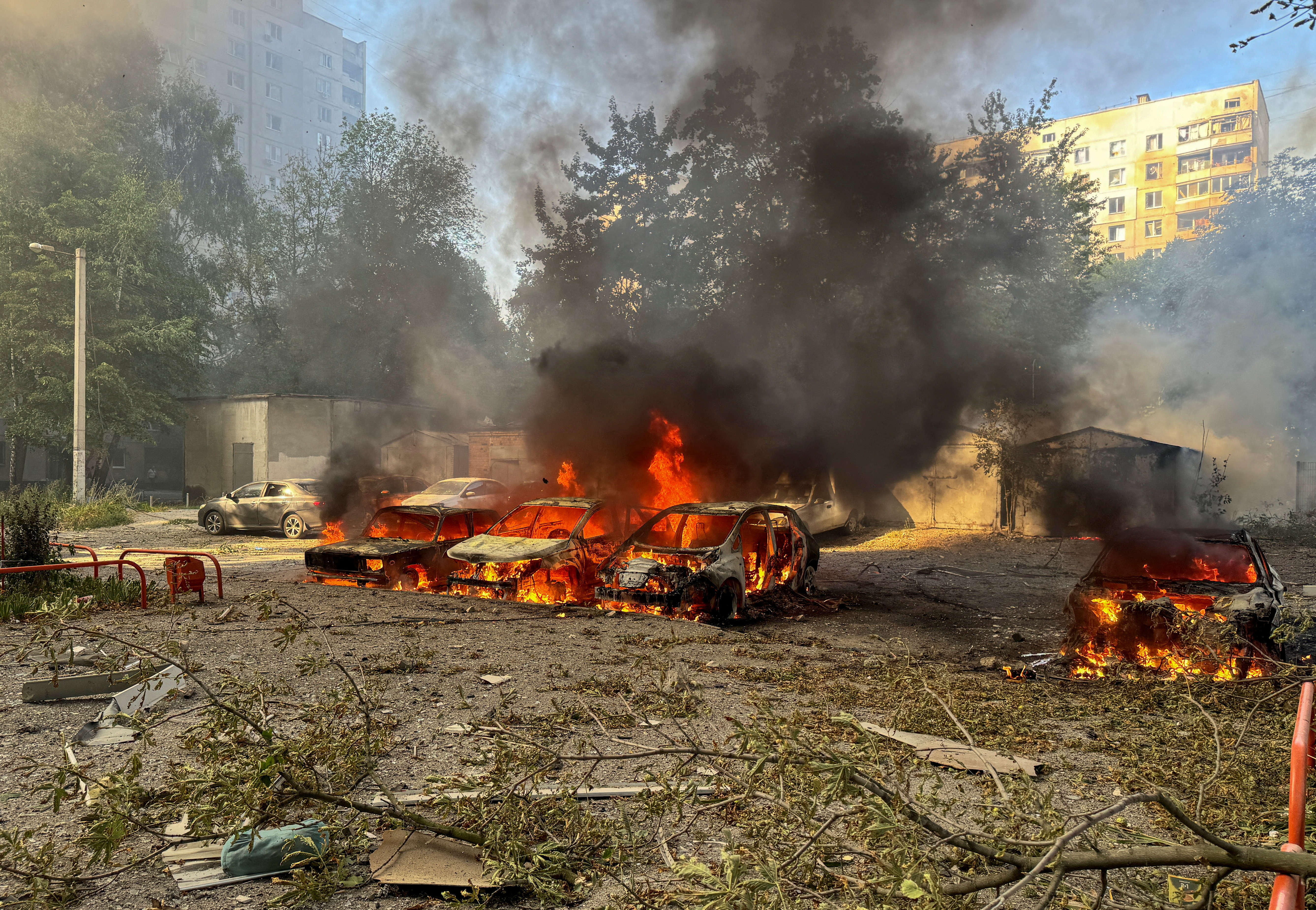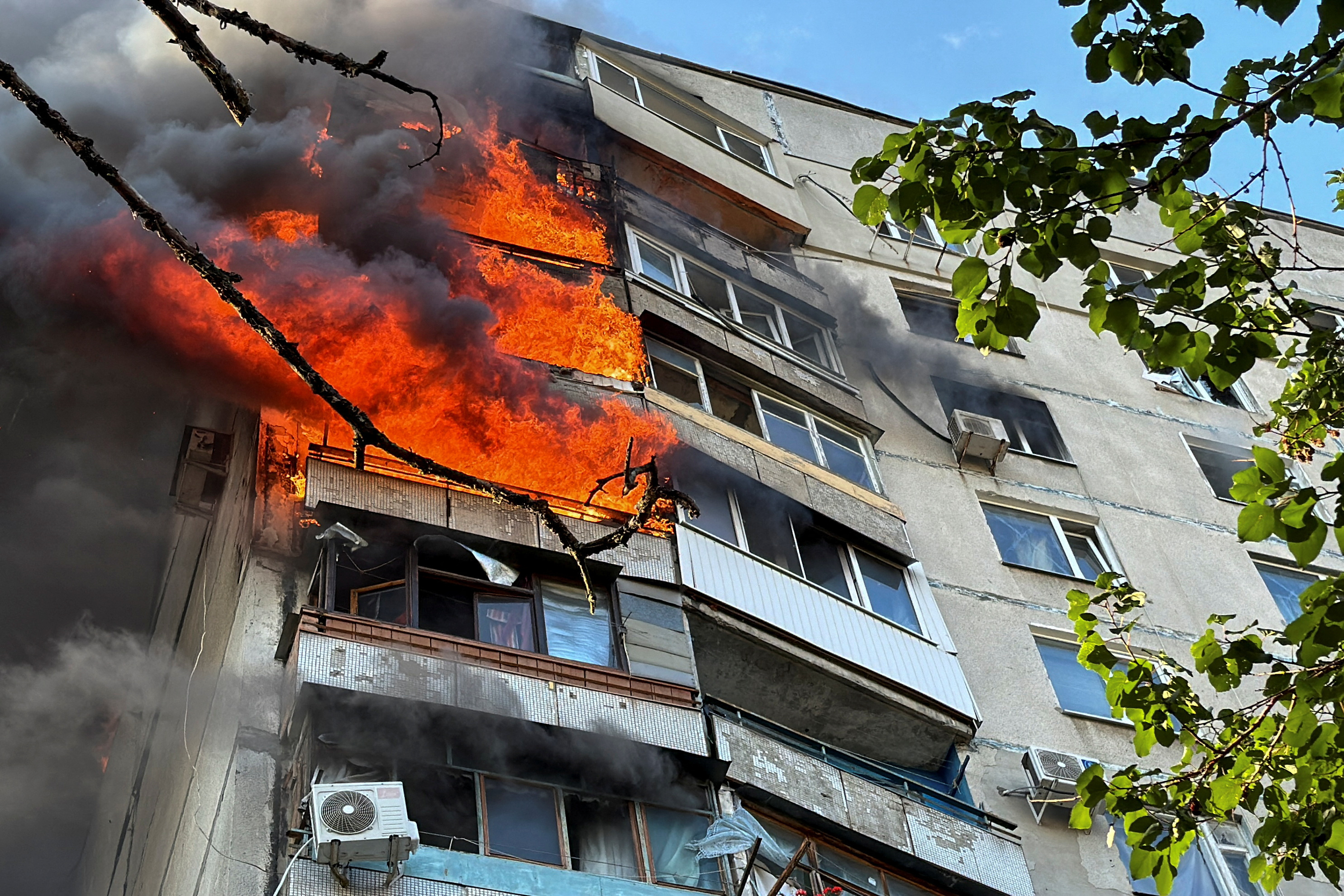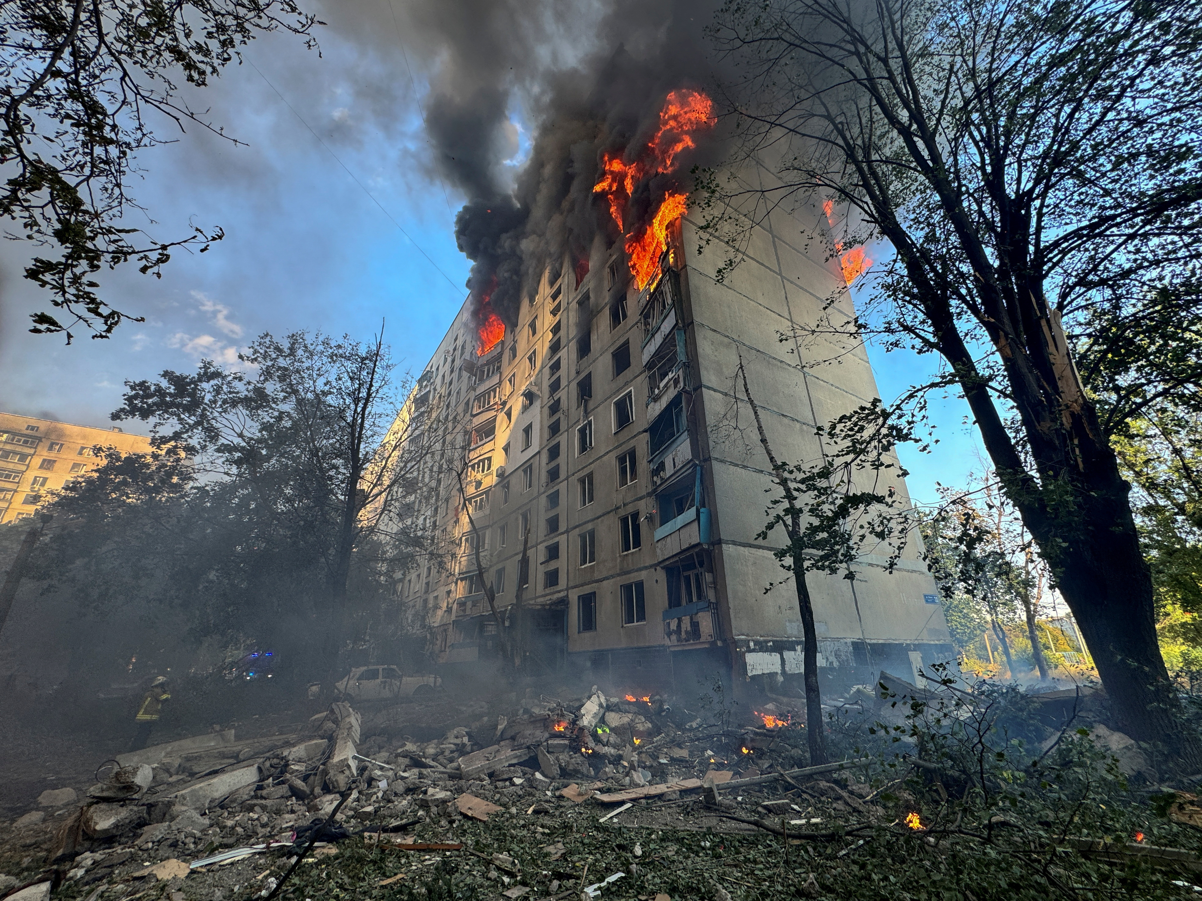 第1项,共6项 一幅画面显示了一栋被俄罗斯空袭击中的燃烧公寓大楼,在俄罗斯对乌克兰的攻击中,乌克兰哈尔科夫,2024年8月30日。路透社/维塔利·赫尼季