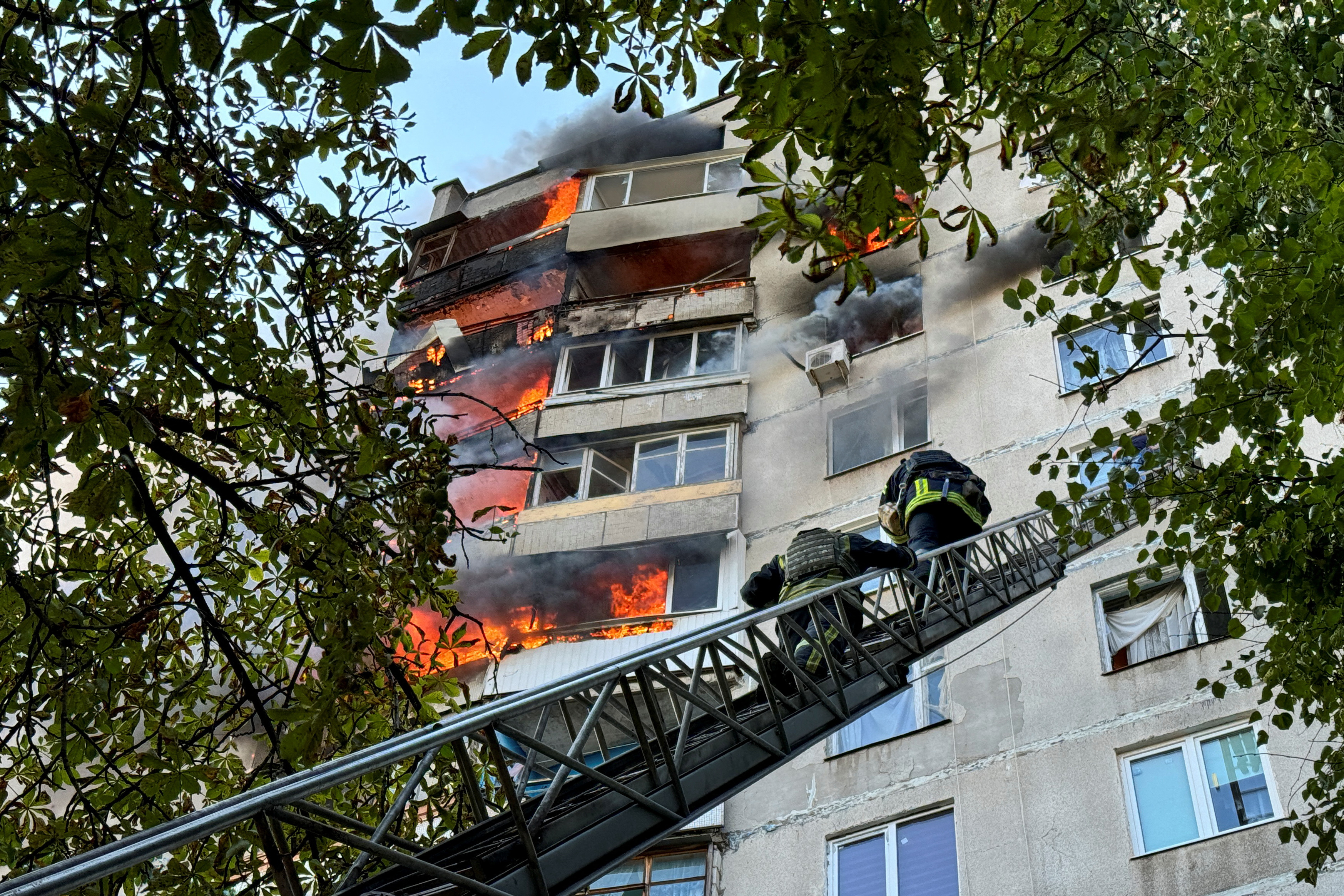 第1项,共6项 一幅画面显示了一栋被俄罗斯空袭击中的燃烧公寓大楼,在俄罗斯对乌克兰的攻击中,乌克兰哈尔科夫,2024年8月30日。路透社/维塔利·赫尼季