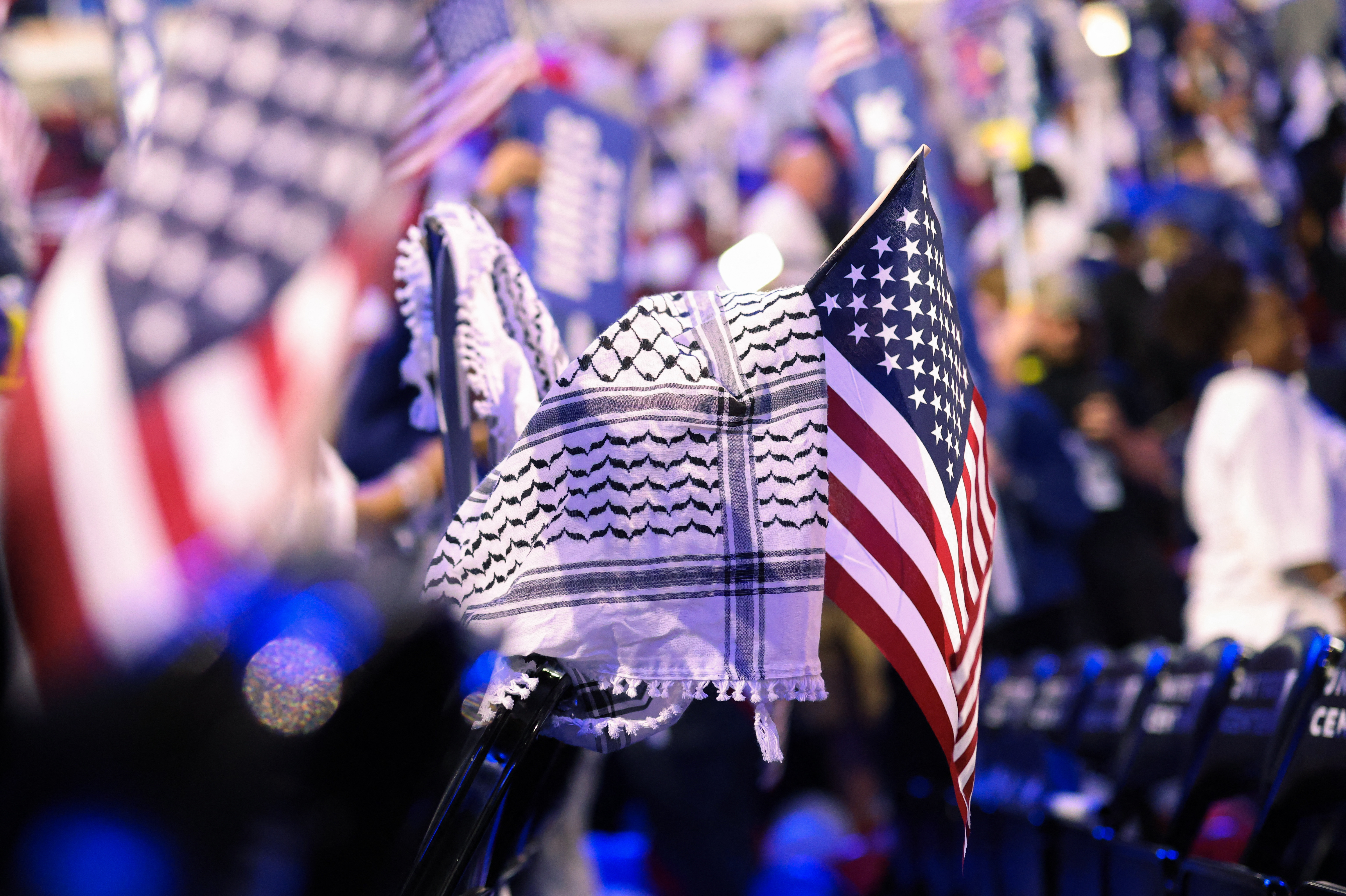 一条头巾挂在美国国旗上,标志着2024年8月22日在美国伊利诺伊州芝加哥联合中心举行的民主党全国大会(DNC)第四天的结束。路透社/阿莉莎·波因特/档案照片华盛顿,8月30日(路透社) - 卡马拉·哈里斯对以色列的强烈支持在其继续在加沙进行战争的背景下,激发了活动人士对即将到来的竞选活动、大学和公共活动中进行新一轮抗议的呼声,他们告诉路透社,描述了她未能倾听亲巴勒斯坦声音的情况。