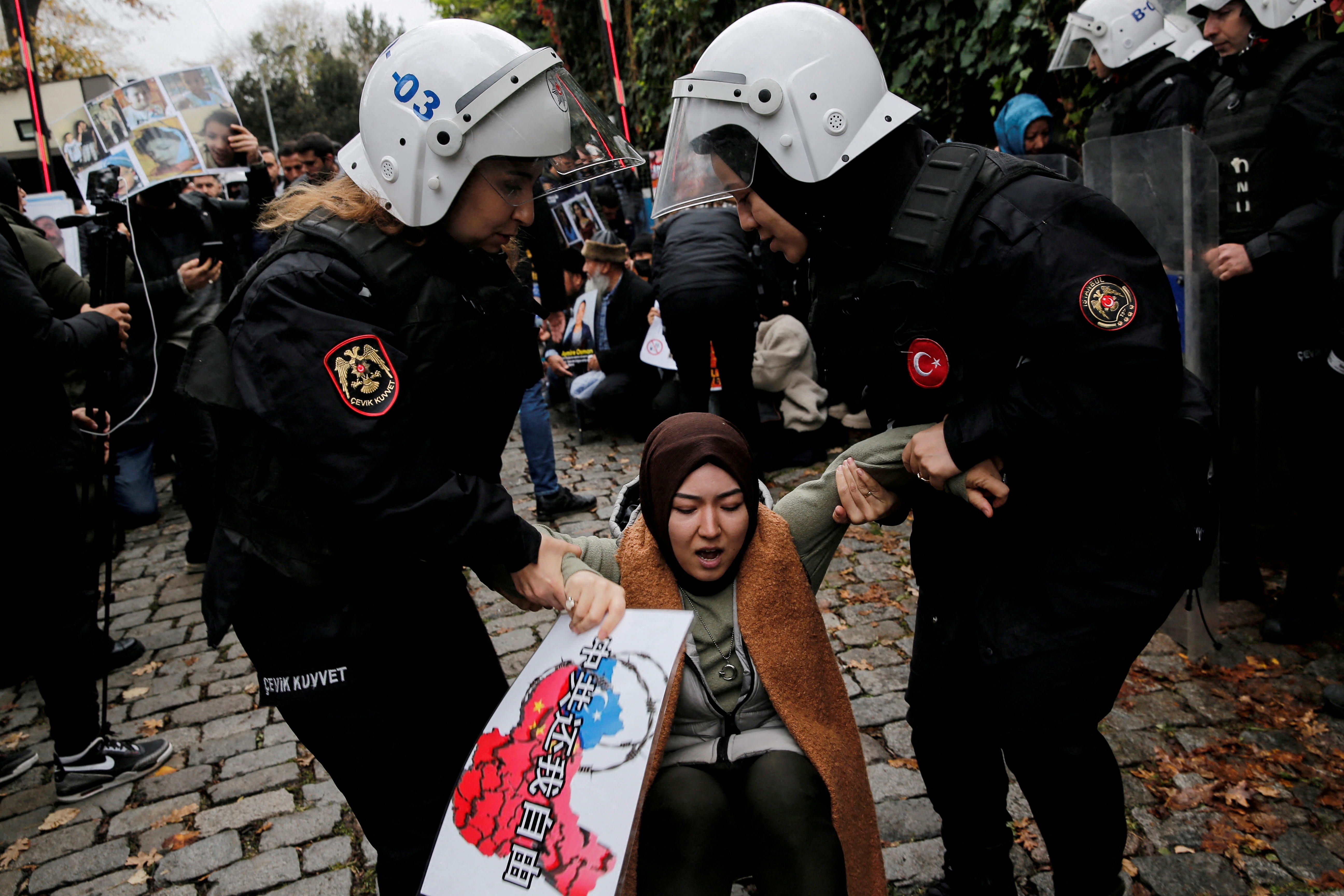 两名维吾尔示威者与防暴警察发生冲突,伊斯坦布尔,2022年11月30日。路透社/迪拉拉·森卡亚