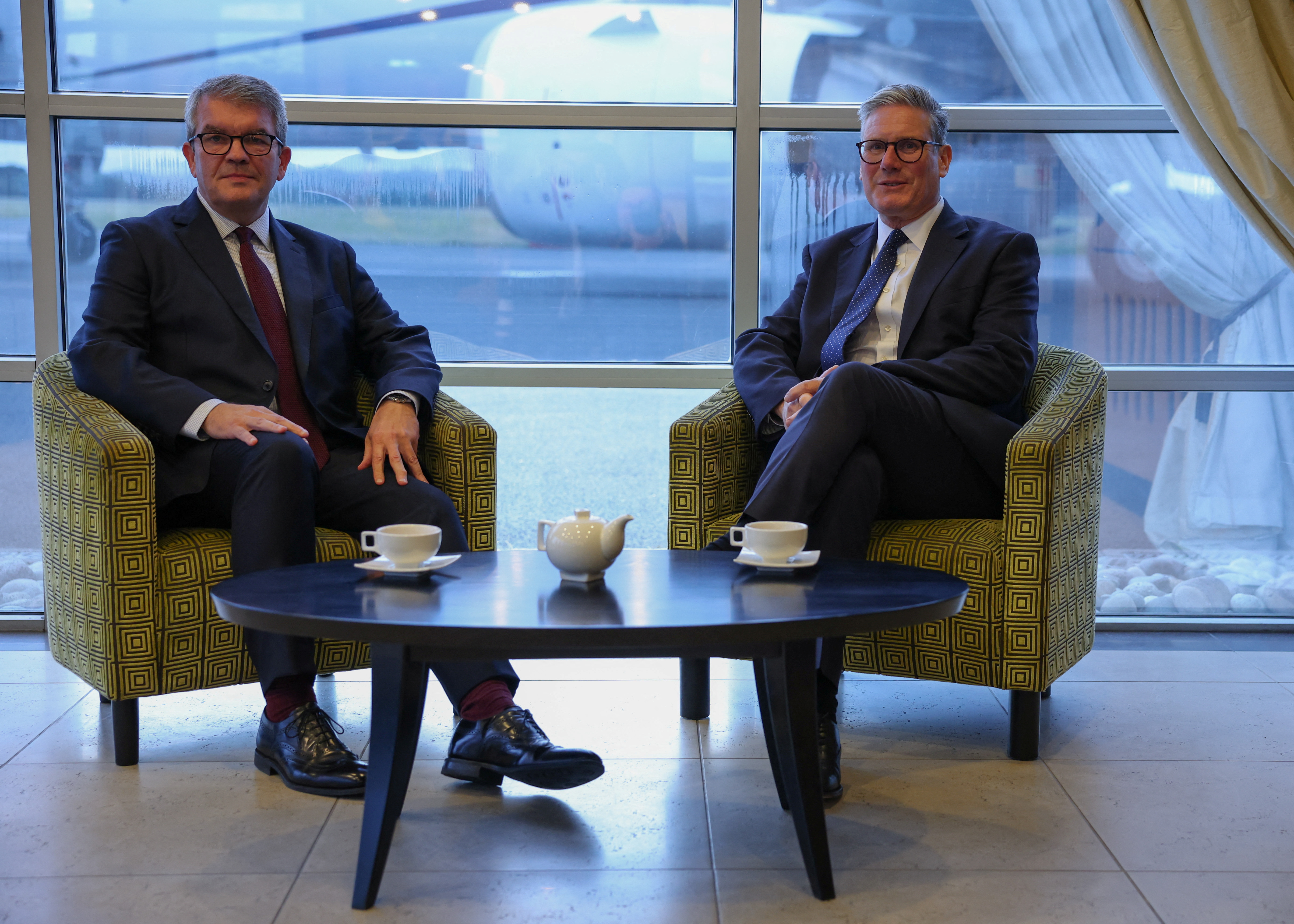 第1项,共2项 英国首相基尔·斯塔默在前往罗马之前,与新的英国边境安全指挥官马丁·休伊特会面,地点在伦敦附近的一个机场,英国,2024年9月15日。路透社/菲尔·诺布尔/池